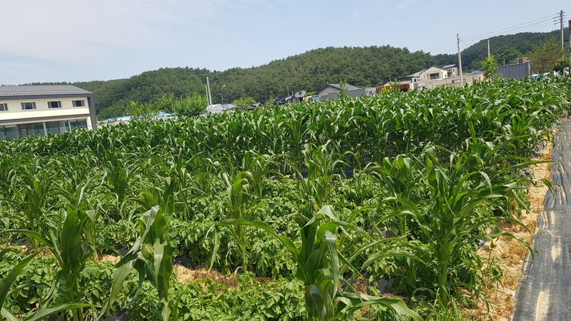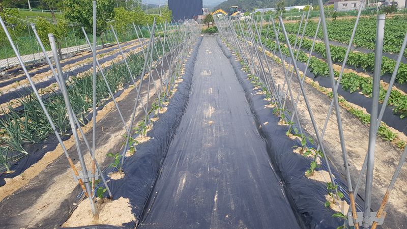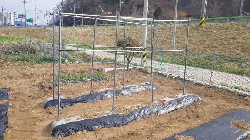 옥수수포토 10판 720구 이식 강낭콩 2줄 심기 여주섶 설치 및 거름 넣기 오이섶 두둑 거름넣기 마늘 및 양파 비료 주기