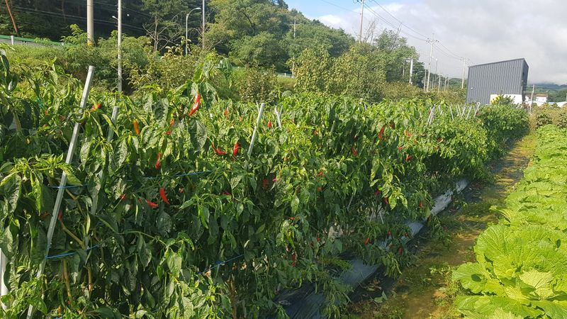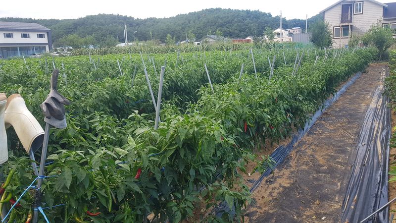 고추 수확 후 세척하여 건조 시작 (7상자) 고추, 들깨, 배추 생육상태 확인 및 살충제 살포 시금치, 열무 씨앗 뿌리기