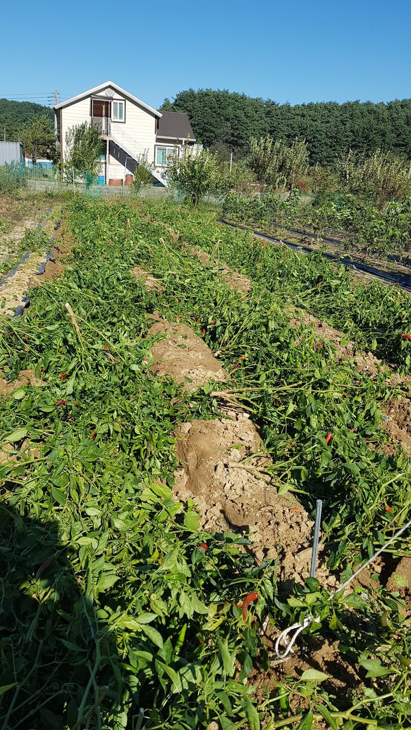 고추 15근 건조 후 운반 배추, 들깨 생육상태 확인 양파 심을곳 퇴비살포 울타리 주변 정리