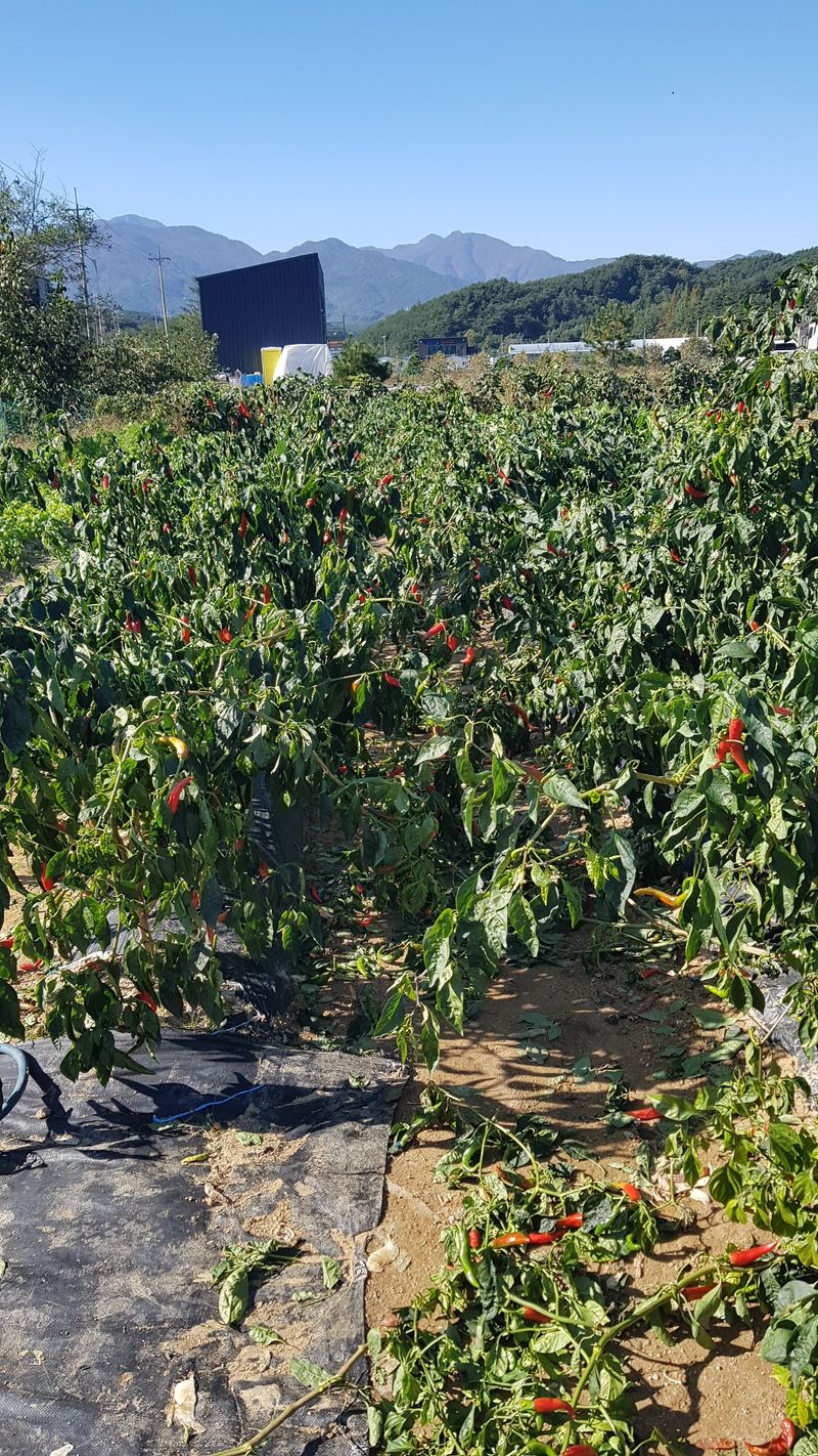 배추 생육상태 및 살충제 살포 고추 건조 (매운맛 11근, 청양고추 3근, 순한고추 6근 총20근) 들깨 꼬투리 나오기 시작 진식이네 벼추수후 운반함
