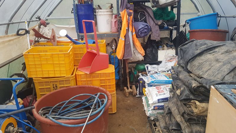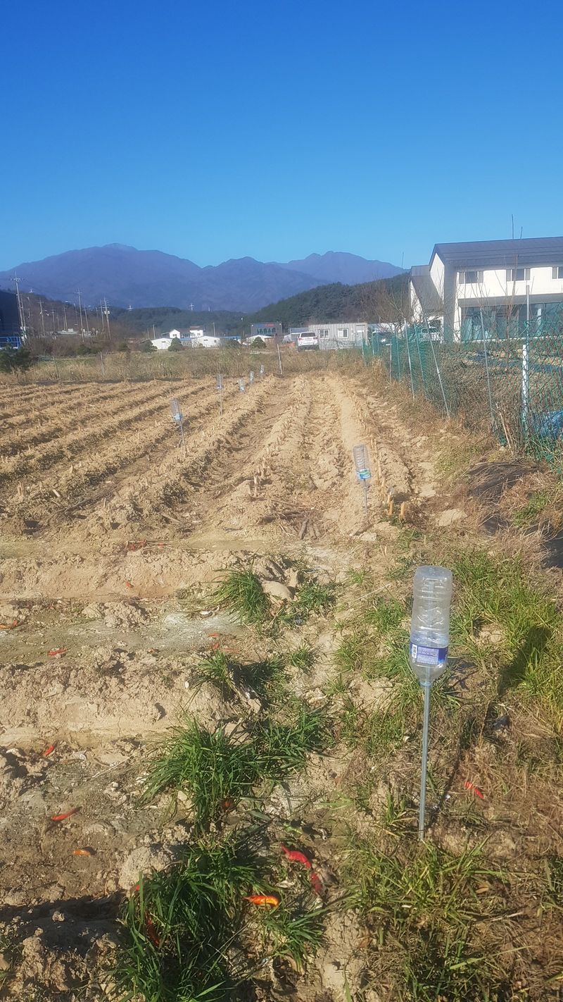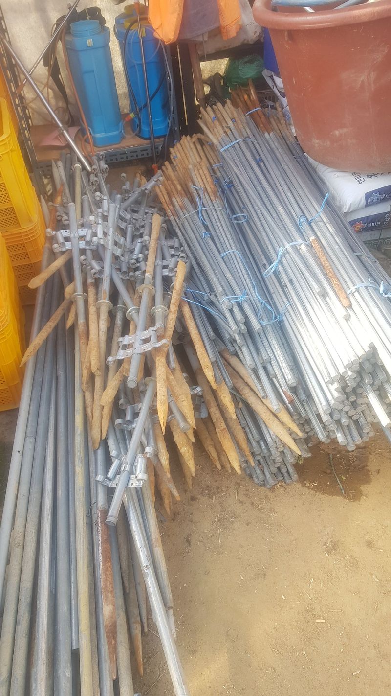고추 지지대 정리 하우스에 보관 두더지 퇴치용 페트병 설치