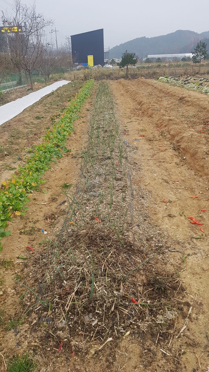 두릅나무 두둑 보수 작업 들깨대 파쇄 양파 생육상태 확인 배추 생육상태 확인