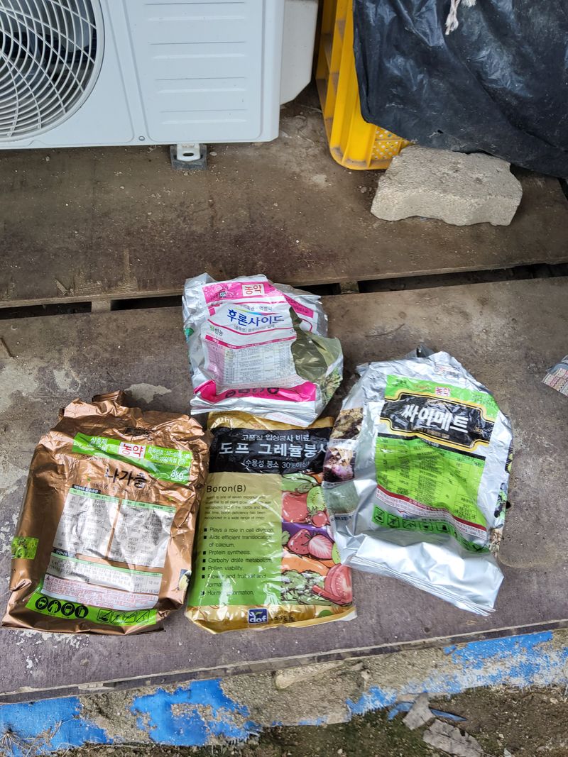 마늘밭에약주기하였다고자리약더블센서2kg싸이메트1kg주었다마늘웃거름nk15kg주고나서물주기하였다