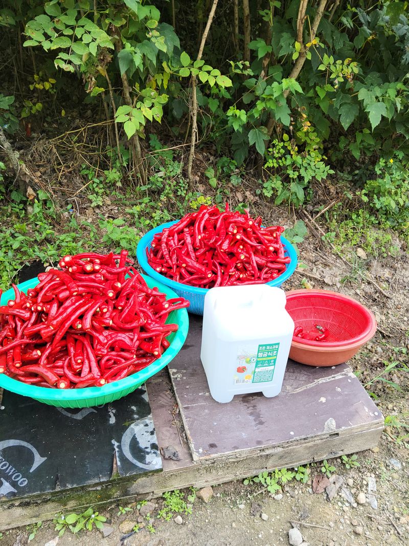 고추밭에병충해방제하였다60리터주었다일반고추 건조기에서3kg청량고추1kg건조하였다