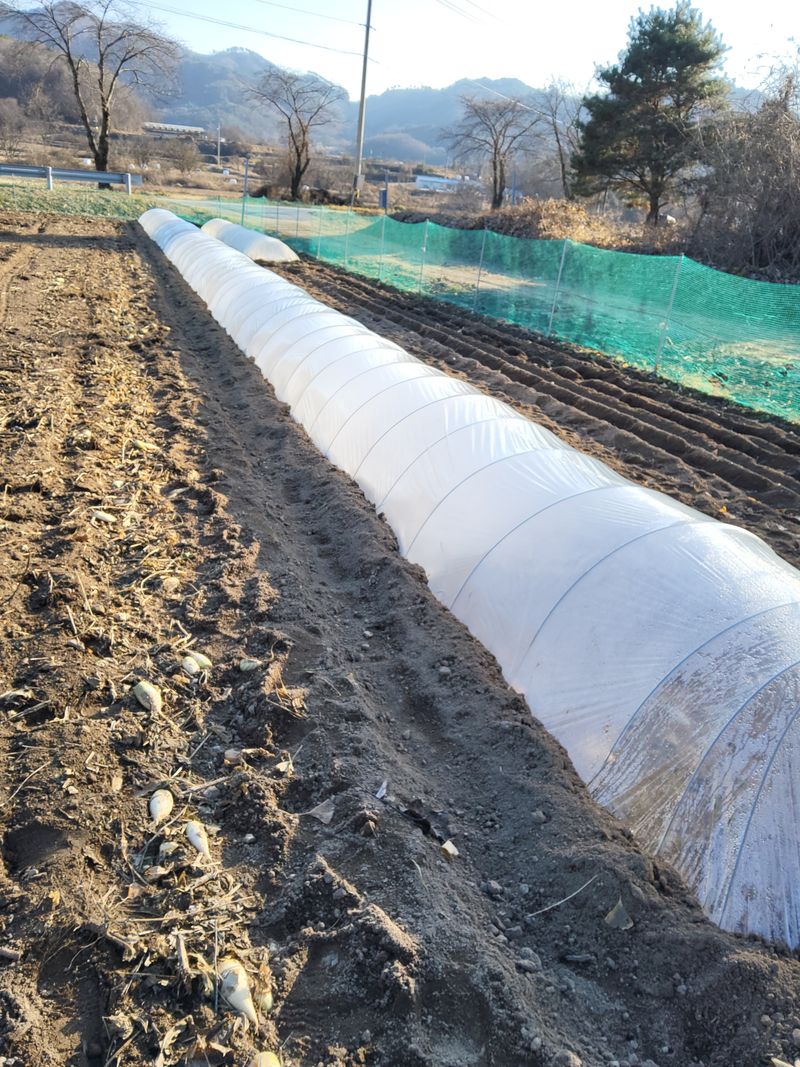 마늘밭에부직포깔고비닐씨우기하였다