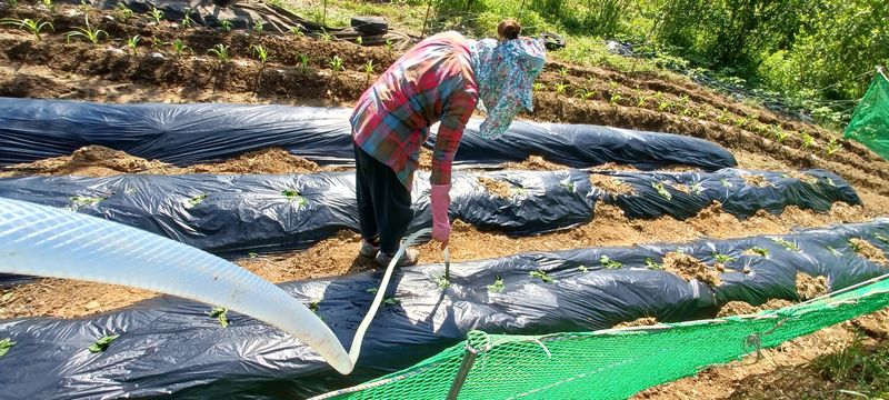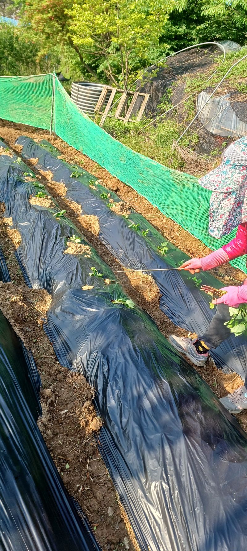 꿀고구마 100개 심었어요. 주말 비가 온다는데 물을 줬습니다. 전용 심는 도구를 썼더니 편하네요
