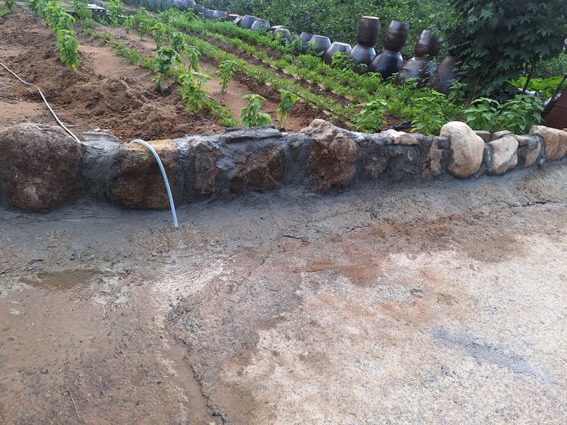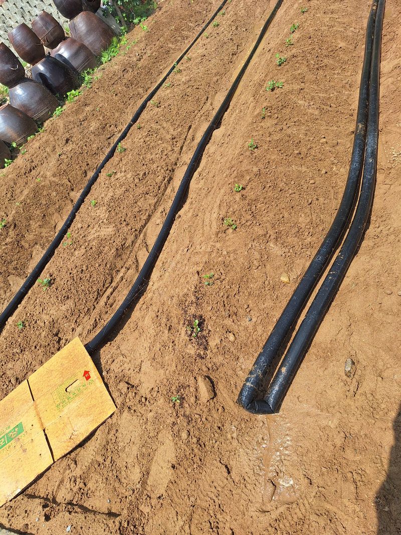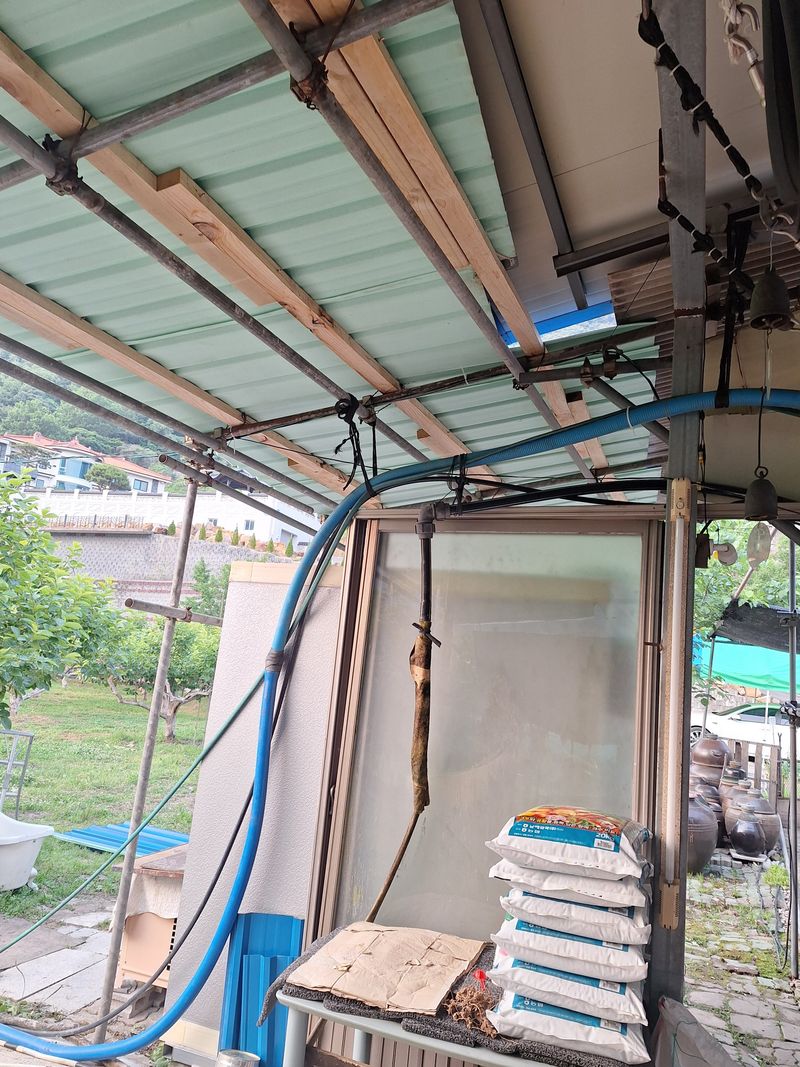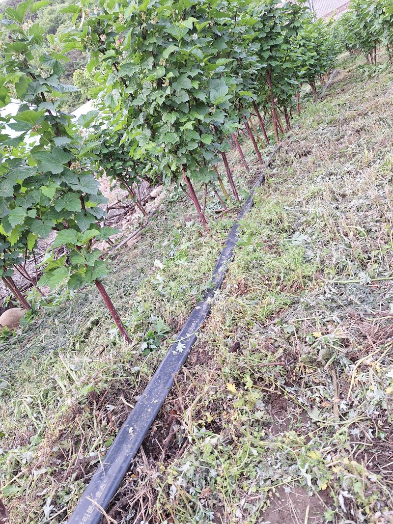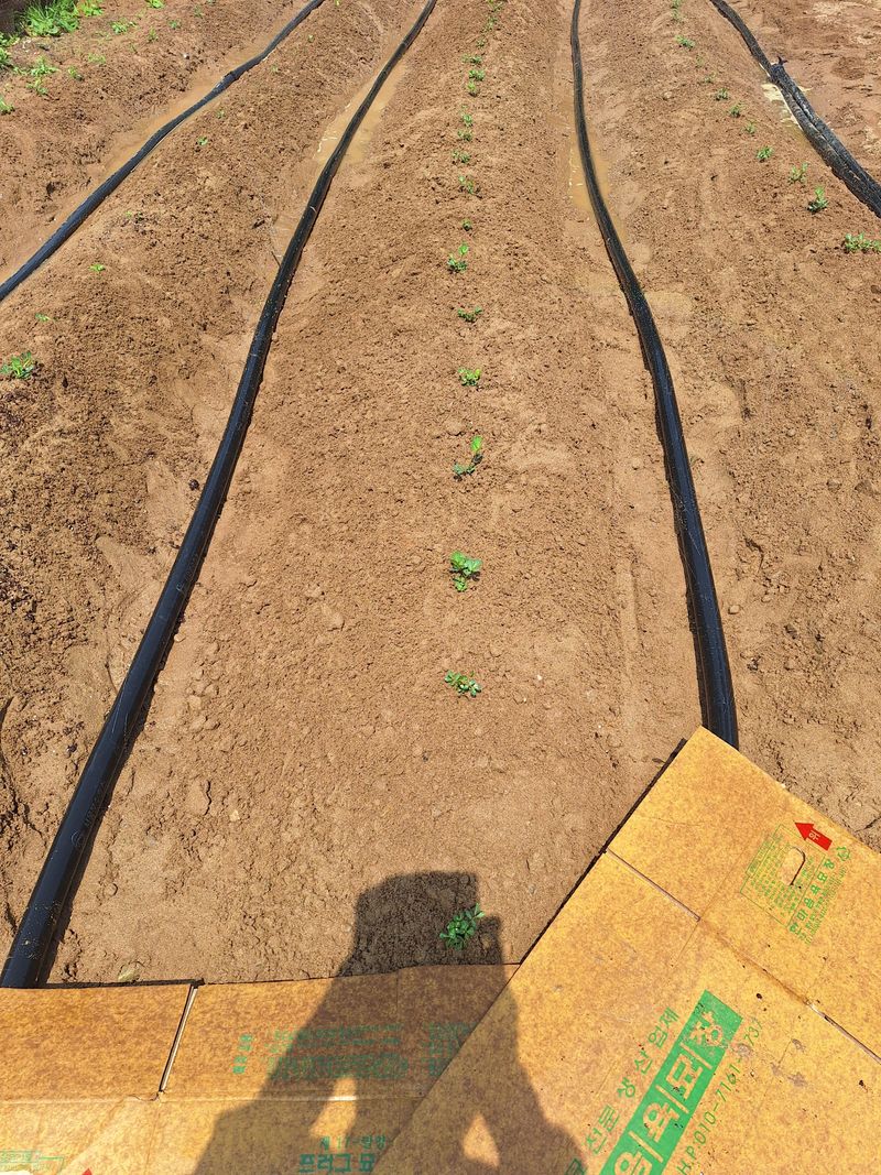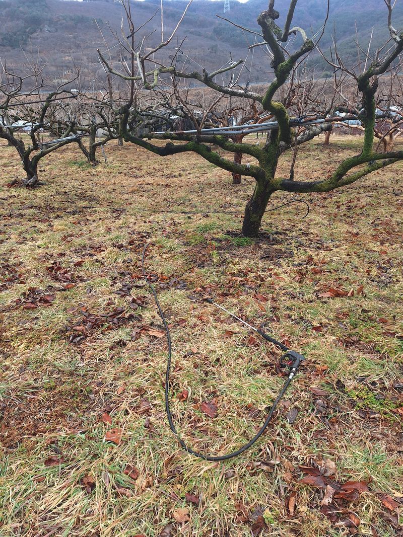 산딸기 밭에 분수호스 설치하고 시운전함.