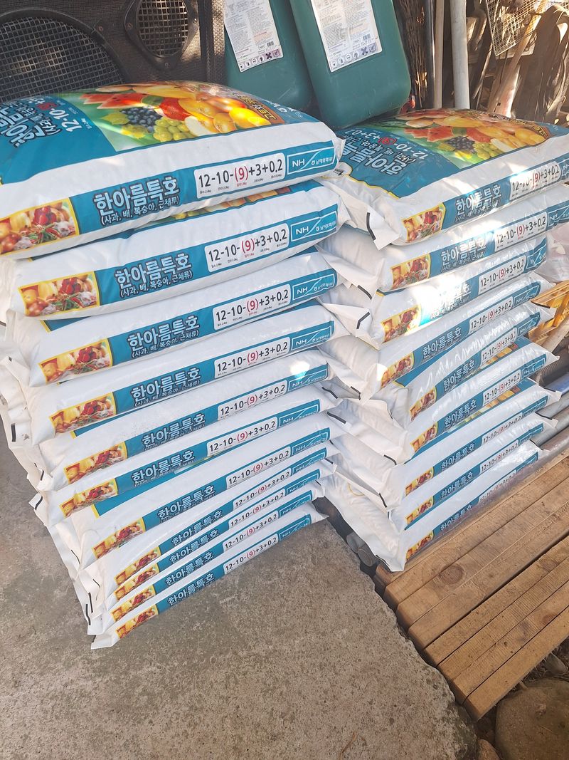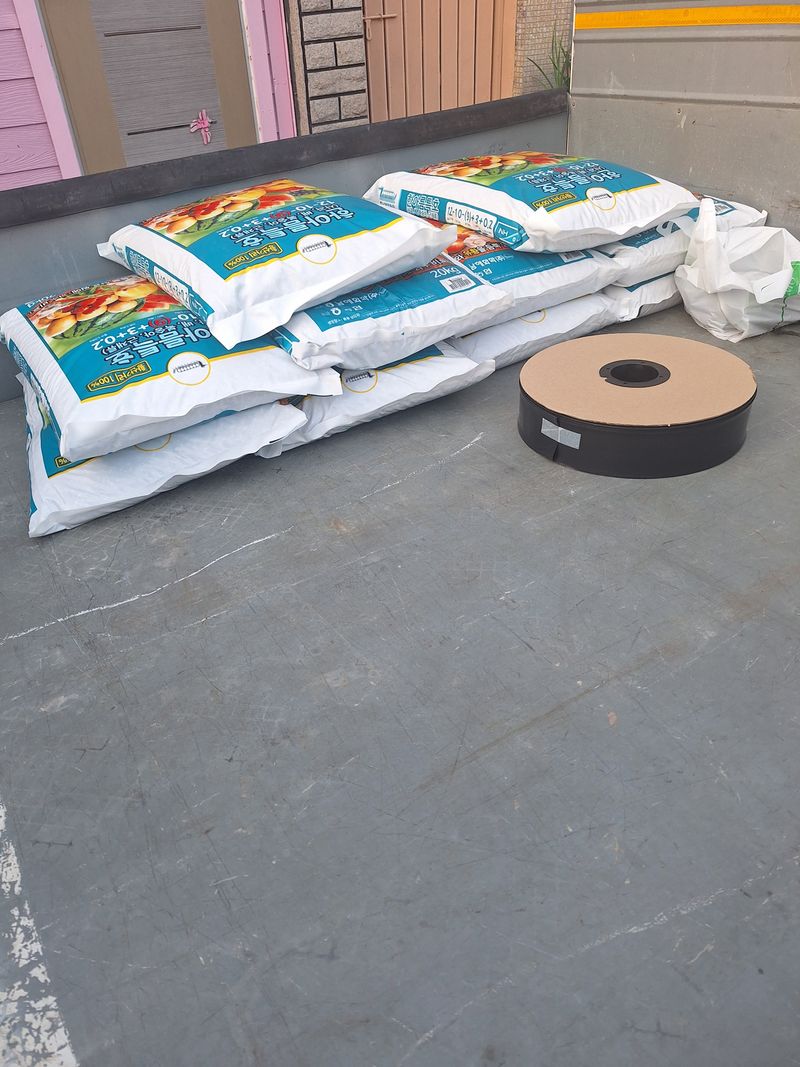 산딸기 밭에 분수호스 작업.과수용 한아름비료 6포 살포함.