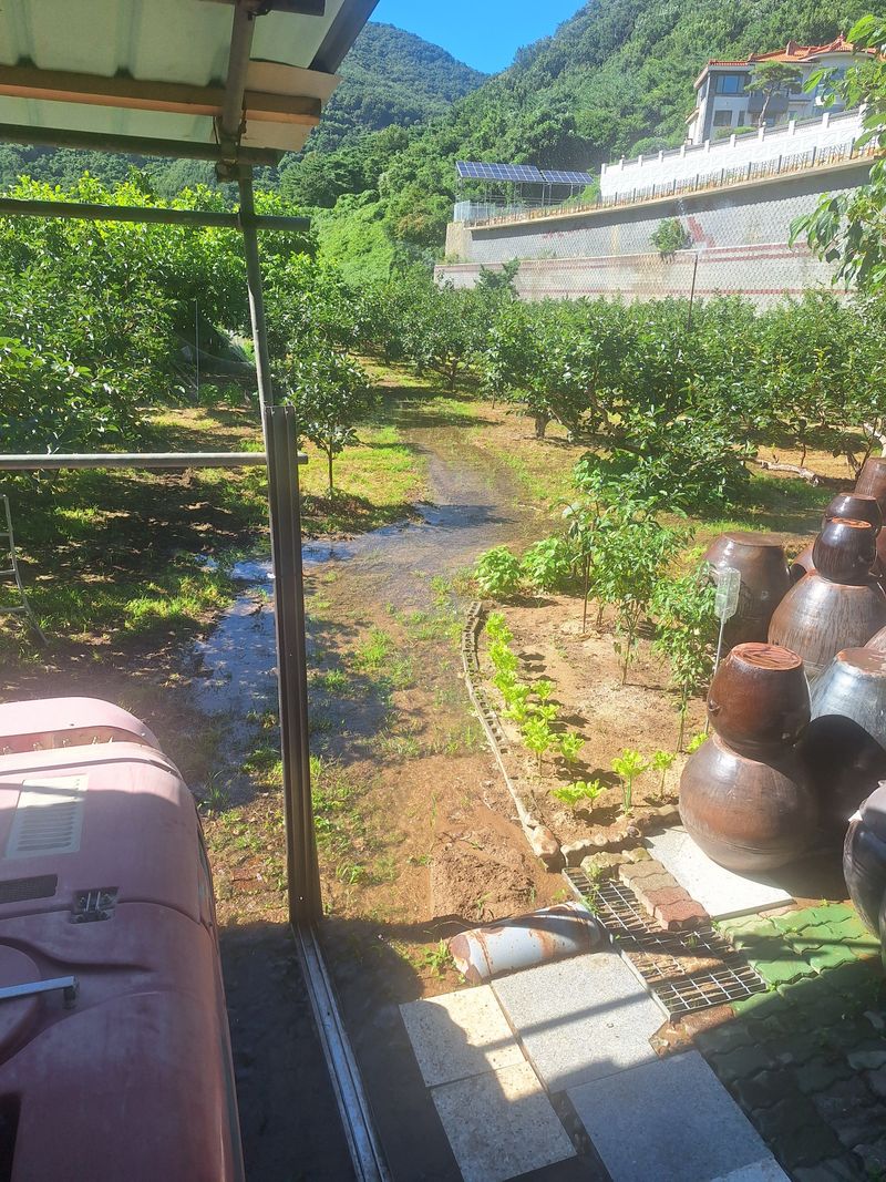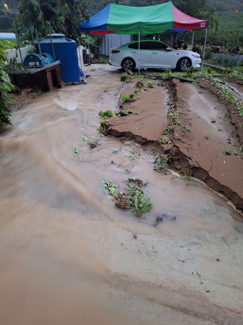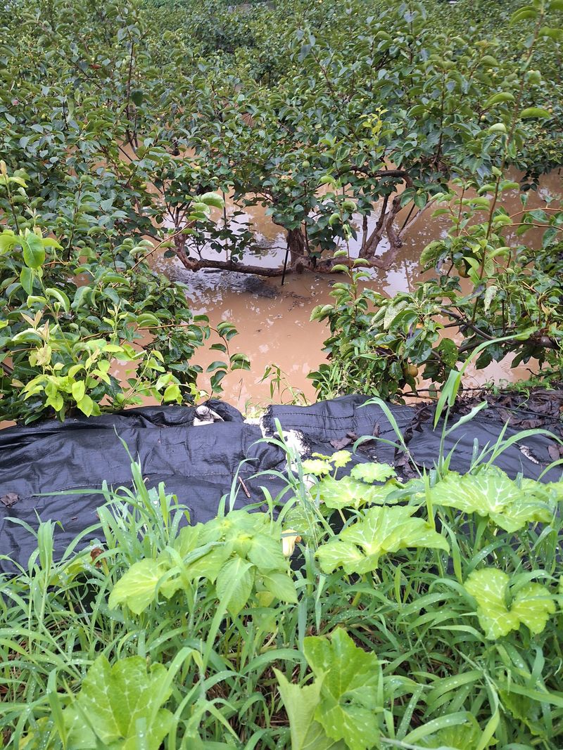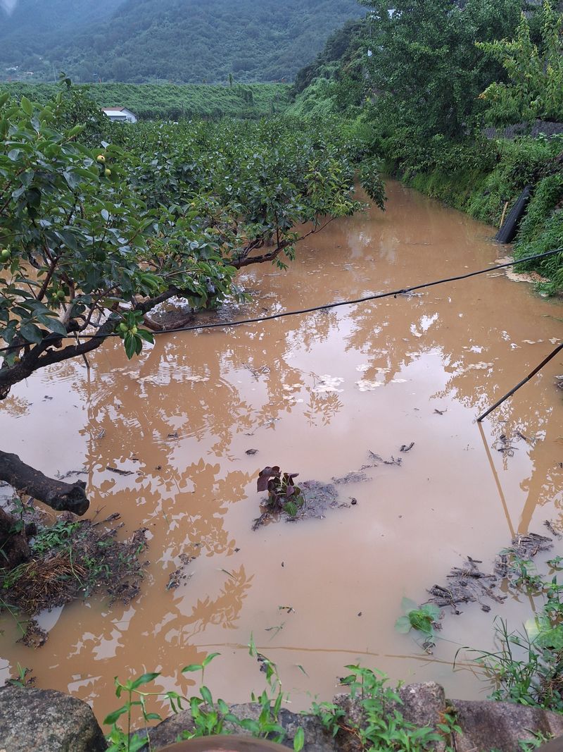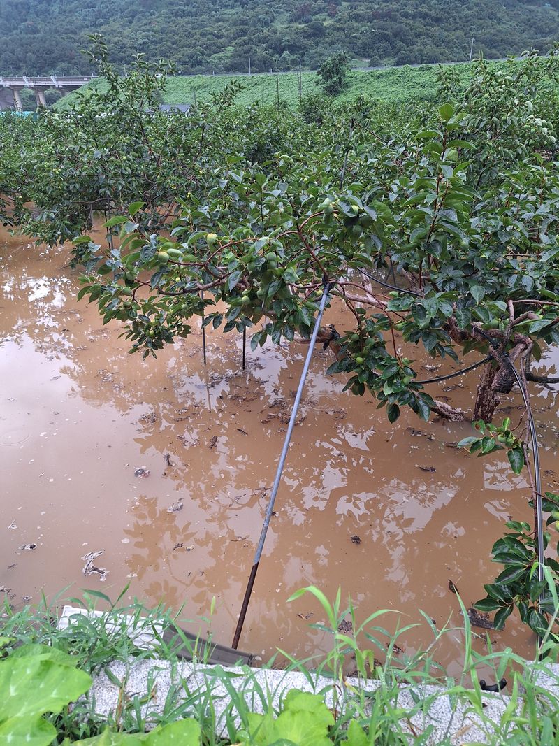 새벽3시에서5시까지 집중폭우로 과수원침수 모습입니다