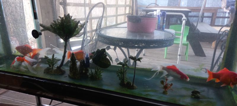물탱크 청소하고 금붕어 물 갈아 주고 있어요.