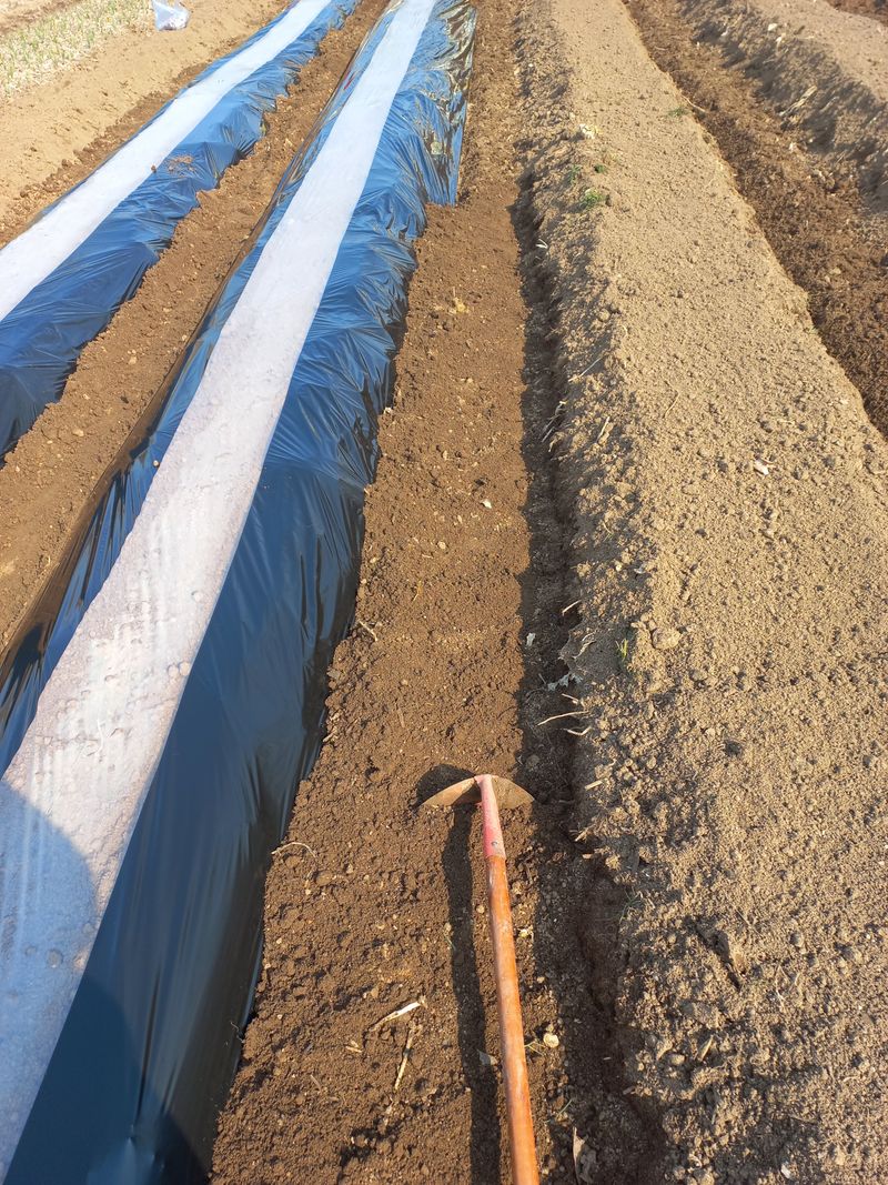 감자밭 퇴비넣고 로타리치기 한 후 비닐 쉬우기 두백감자싹이 많이나서 한고랑 심기