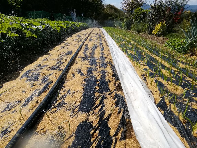 9월28일 마늘심을두둑 고두둑양쪽으로 분산 1m40으로흑색유고비닐 8구짜리로1.300구 유박밑비료.토양살충재3가지. 왕겨마무리하고 비닐덮고 ...