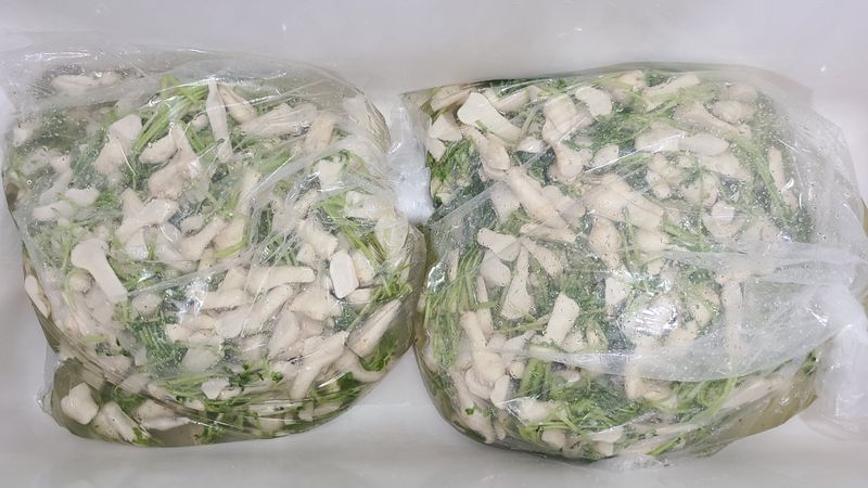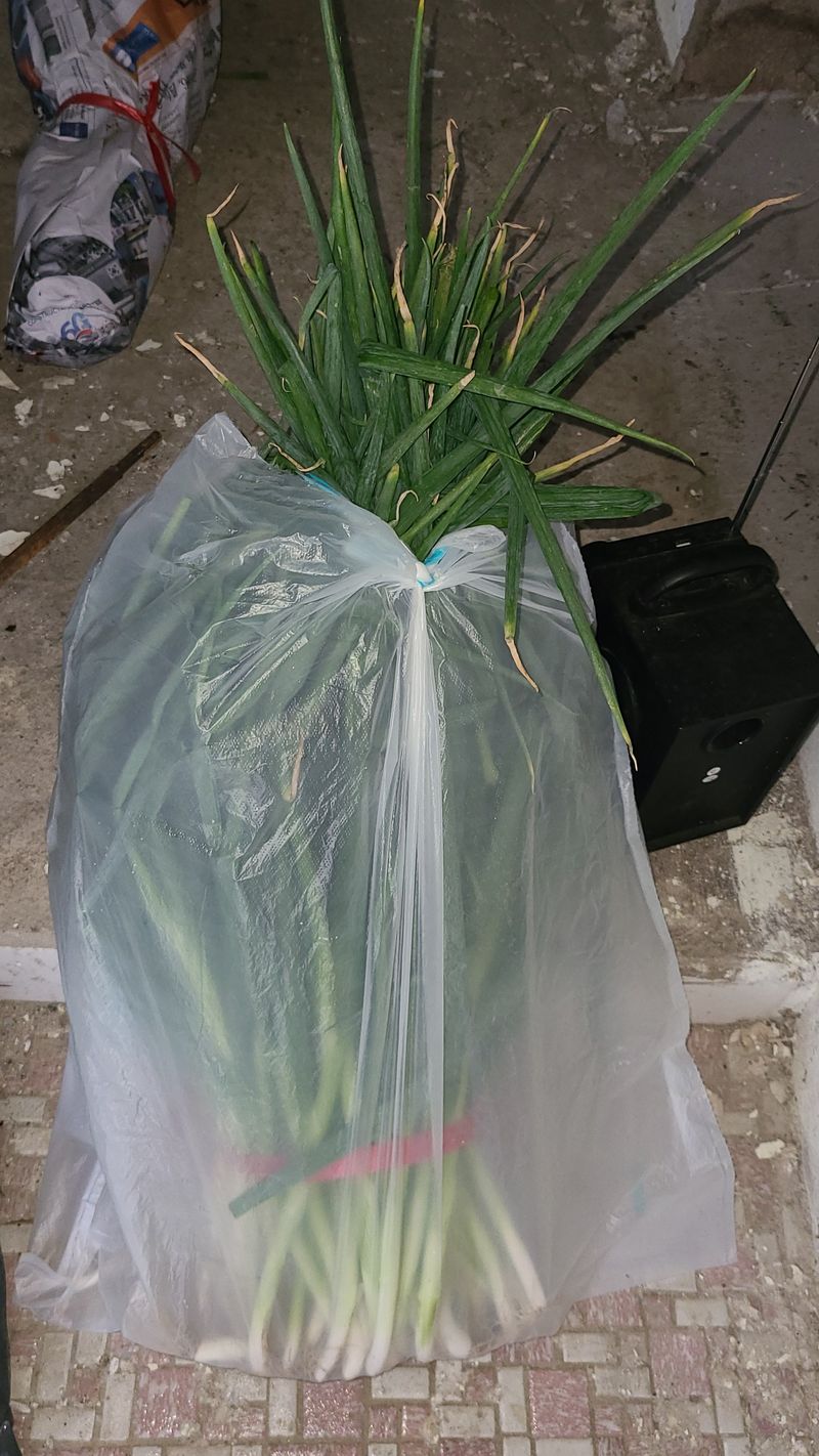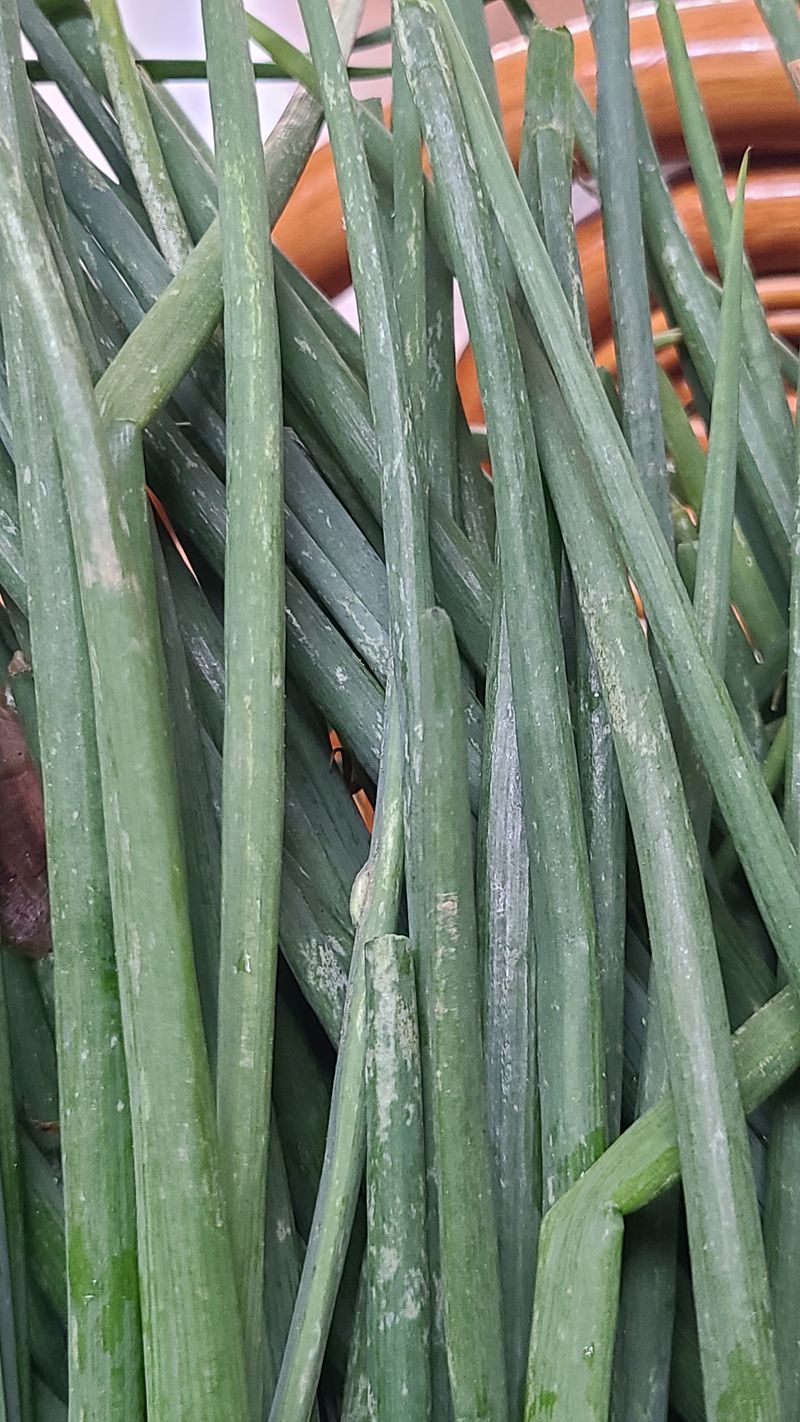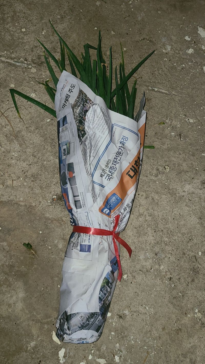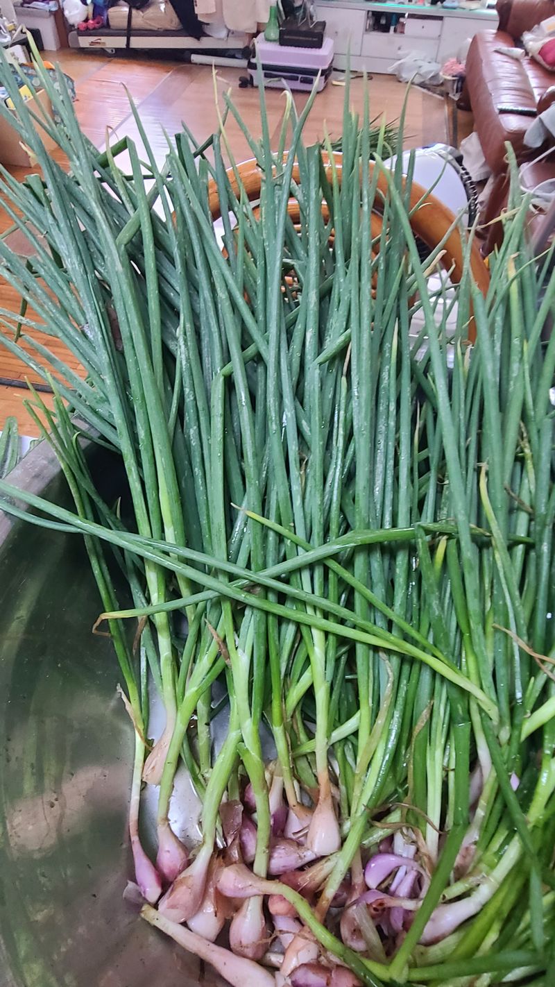 쪽파4단 수확. 파김치 담금. 나방 피해가 큼(잎에 은색실 금. 유충)