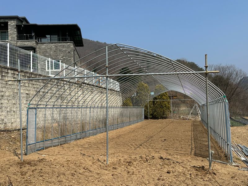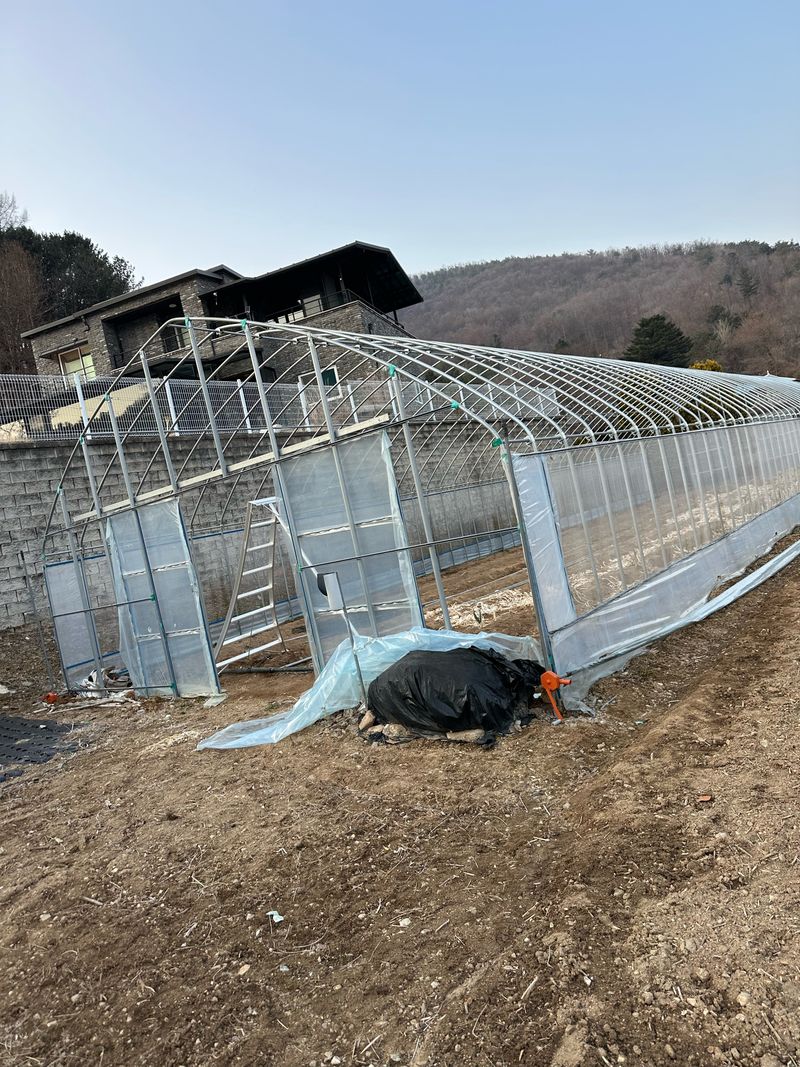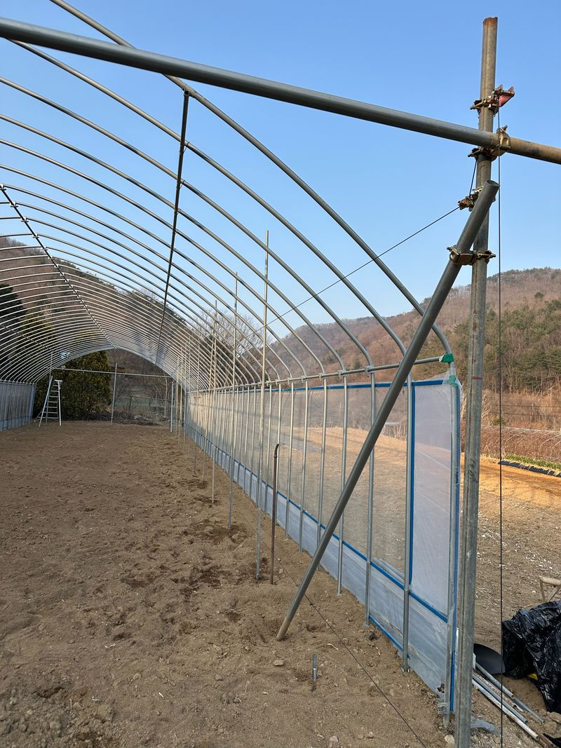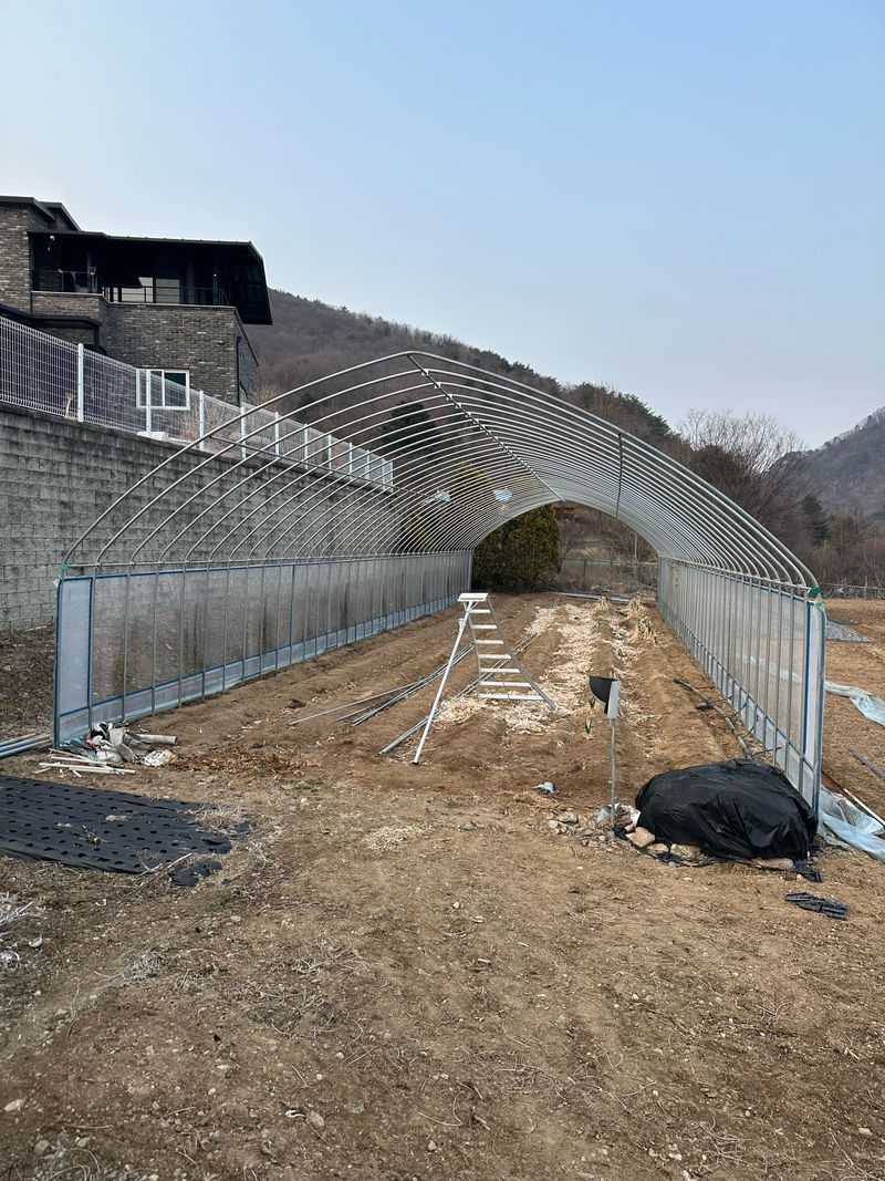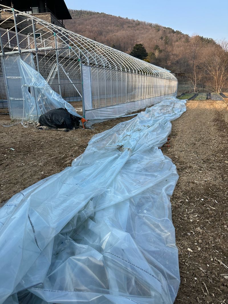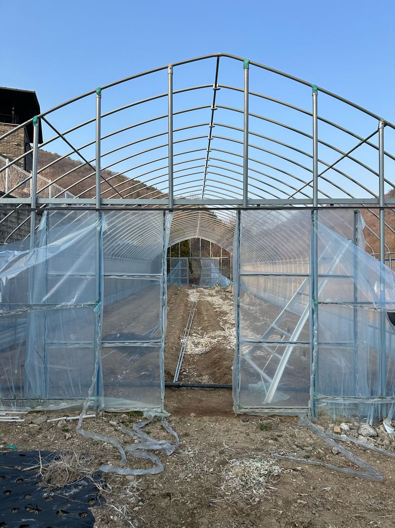 날씨흐림 하우스내 비닐 및 물호스 제거 완료 하우스 보조철제 제거 마늘밭 이랑 사이 부직포 설치