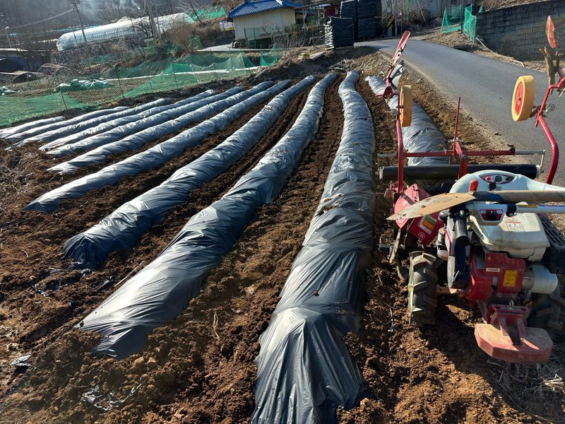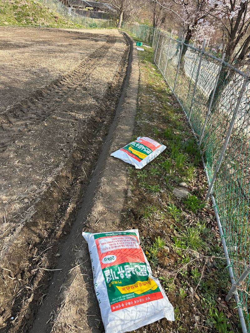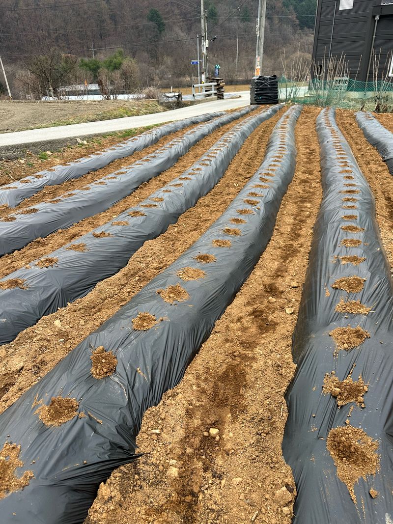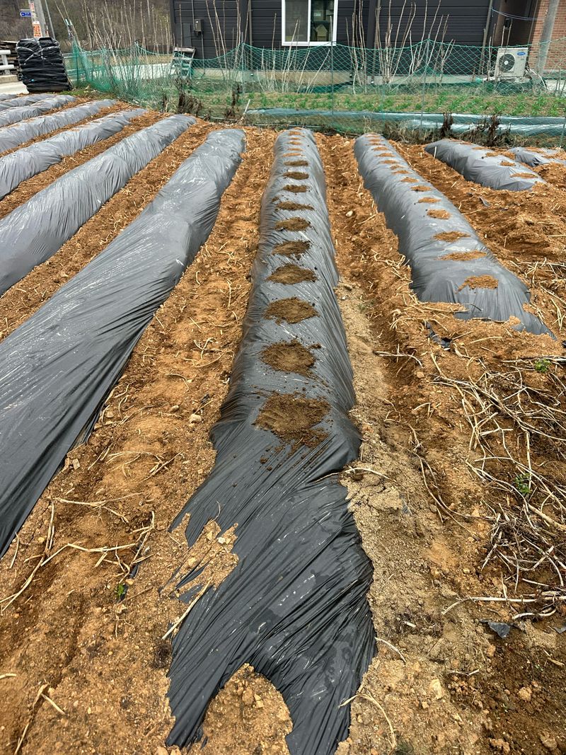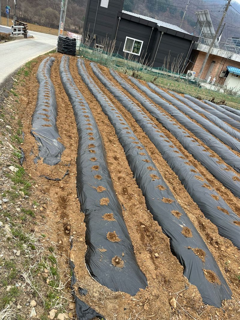 날씨맑음 논 퇴비(100포) 살포 완료 간자심을곳 비닐씌우기 완료