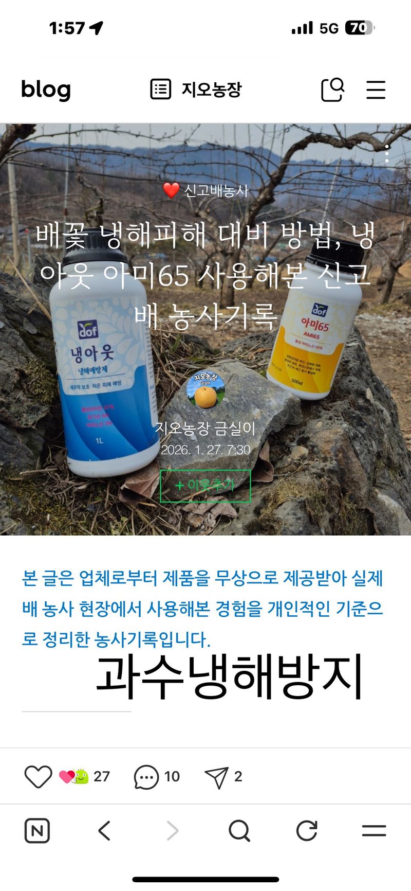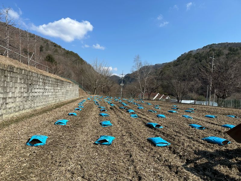 날씨맑음 논 문전옥답 유기질비료(10포) 살포 두룹 첫시식하기