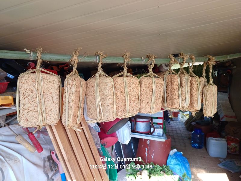 메주콩 가마솥에 삶아서 초벌말리기로 건조한것을 볏짚으로 묶어 자연건조 작업