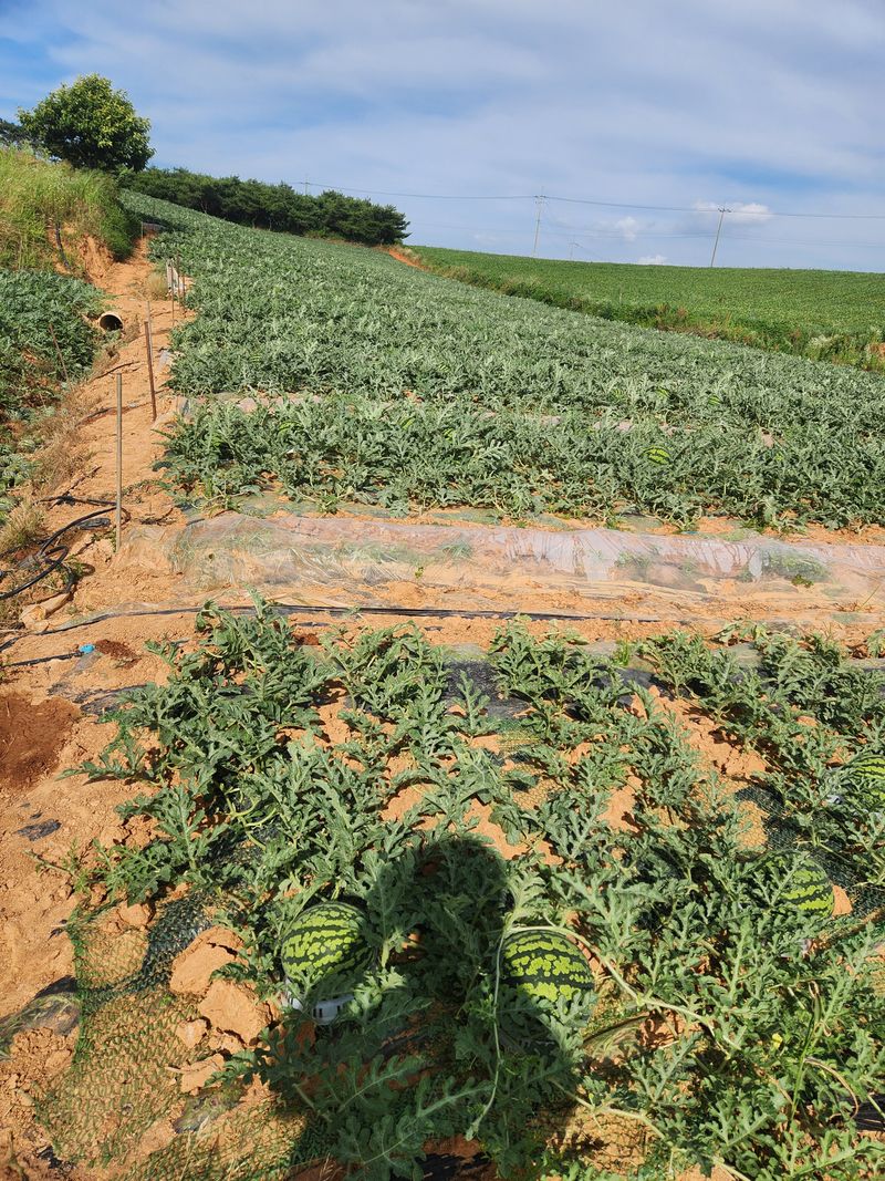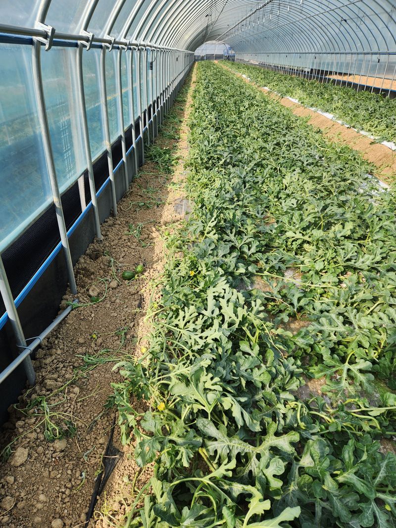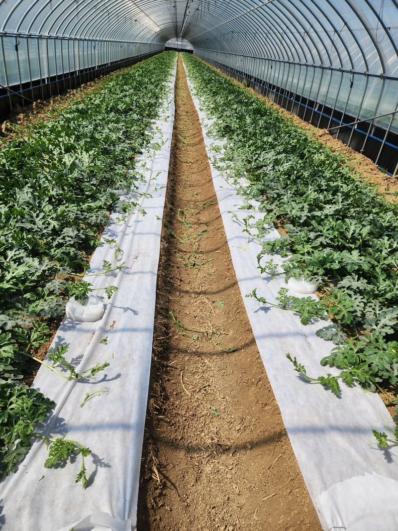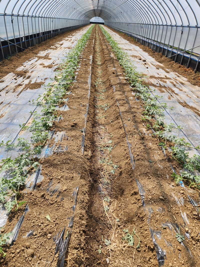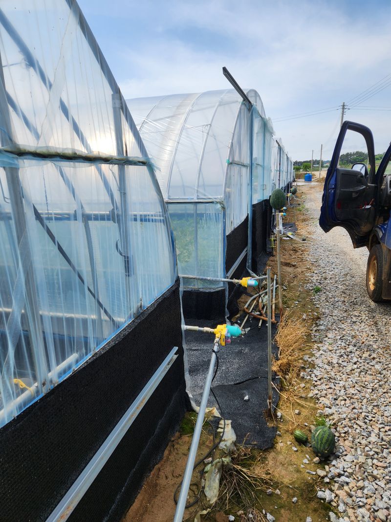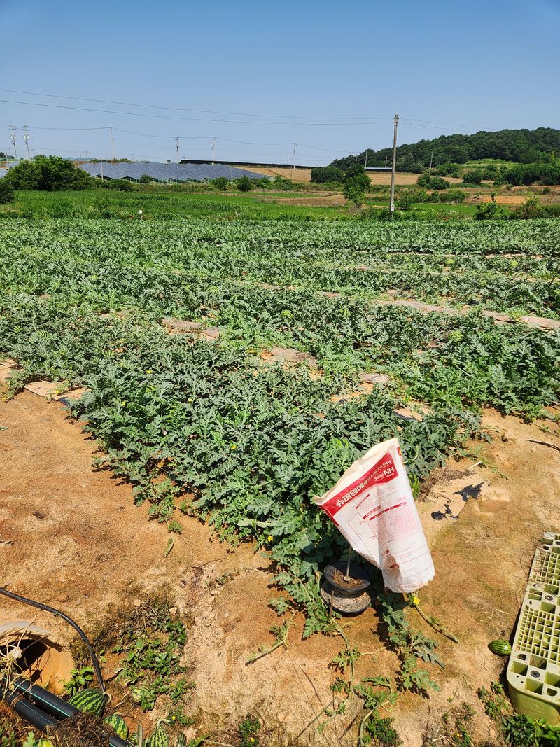 노지수박 생육상태 불량한것 골라서 영양제 살포작업. 논 시설하우스 시공완료