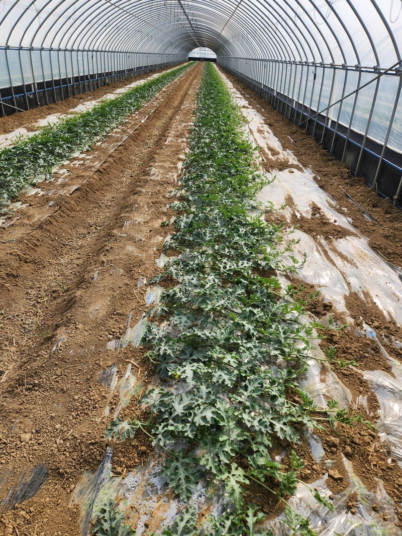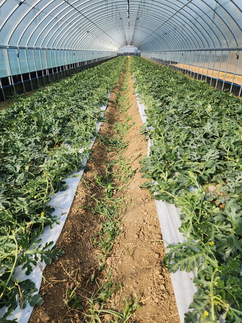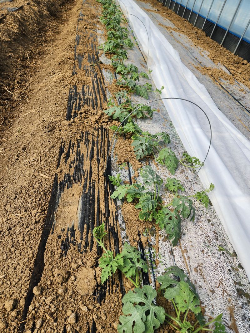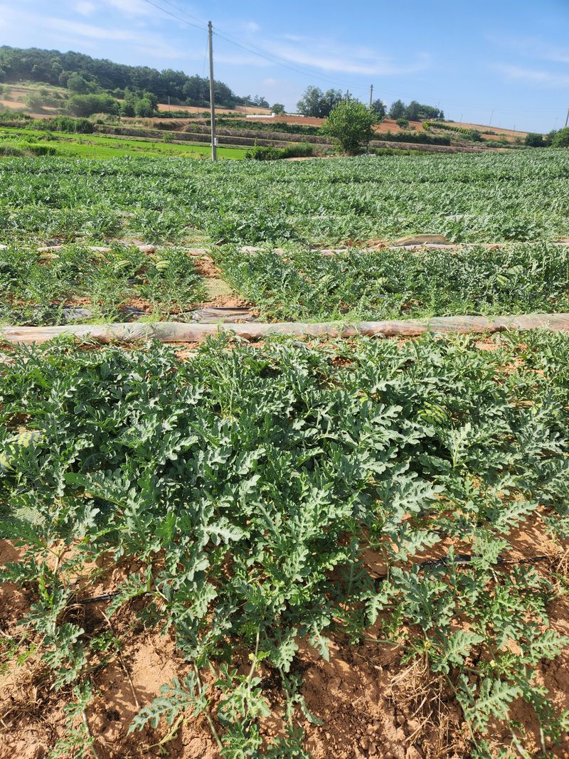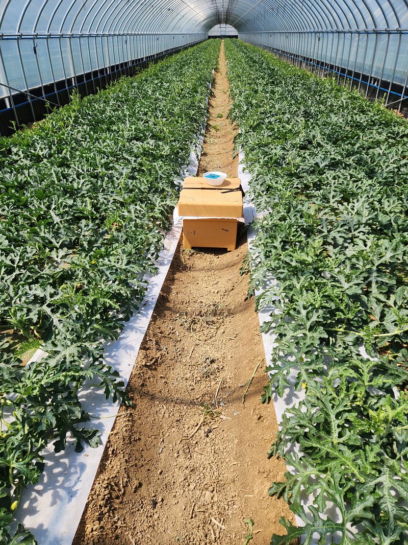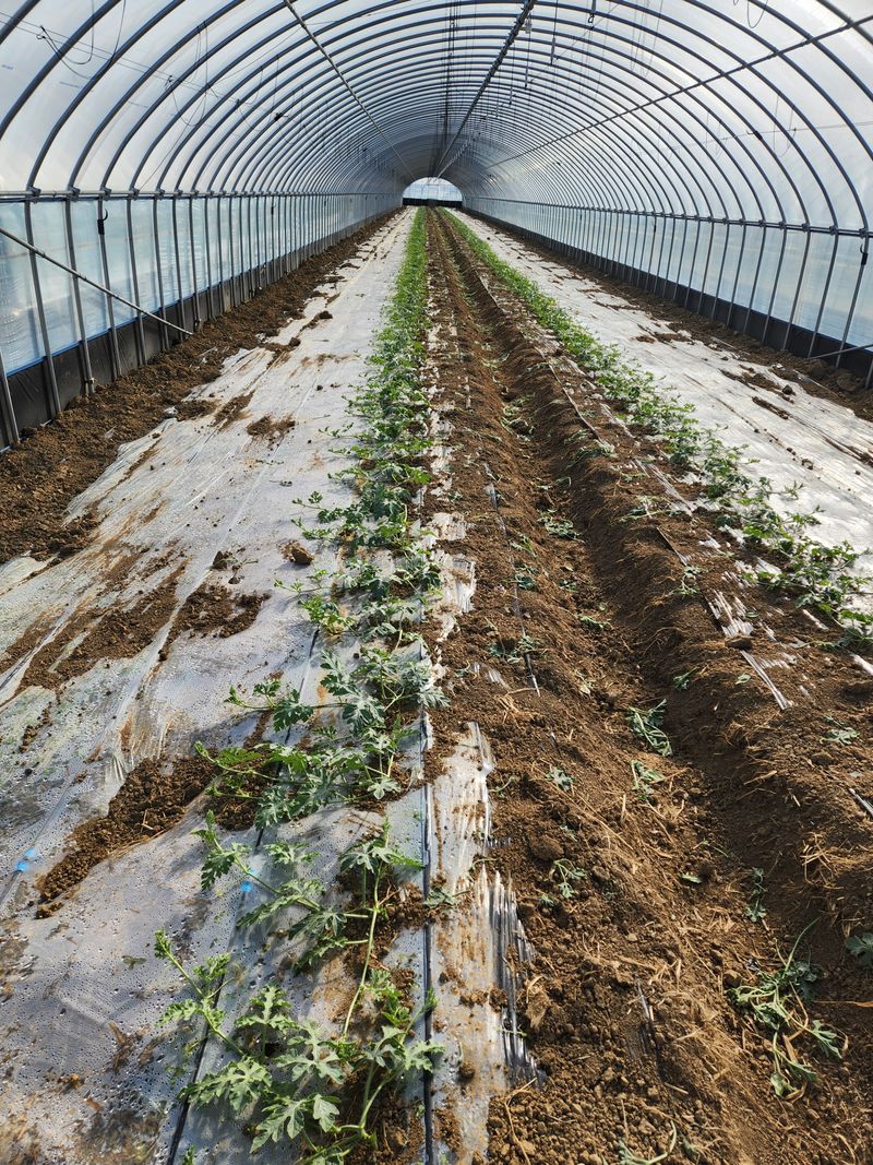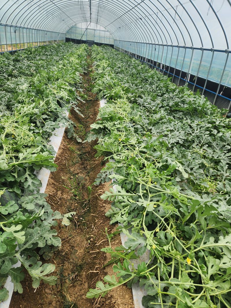 노지수박 생육상태 불량한것 골라서 영양제 살포작업. 논 시설하우스 시공완료