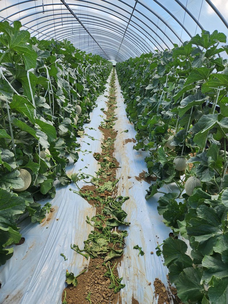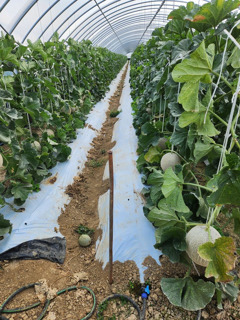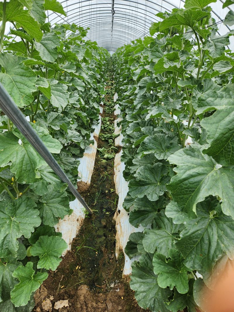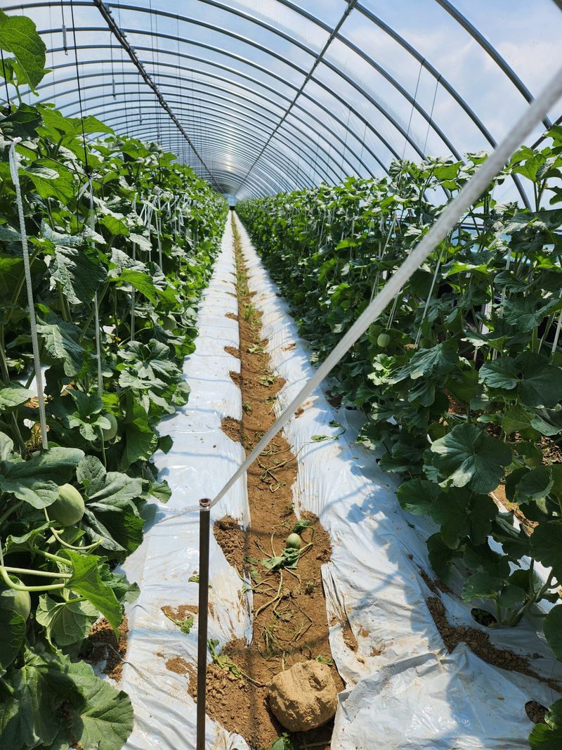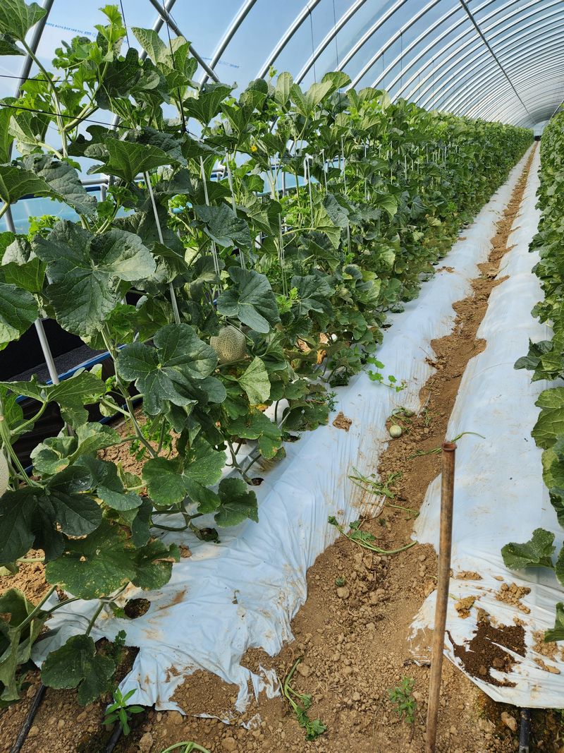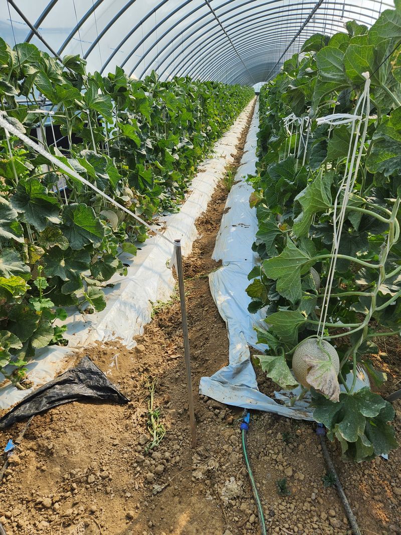 1차메롱 3번째 순감으면서 12잎.13잎 측지 빼기. 노지수박밭 고랑 비닐걷고 순.그물망 제거작업