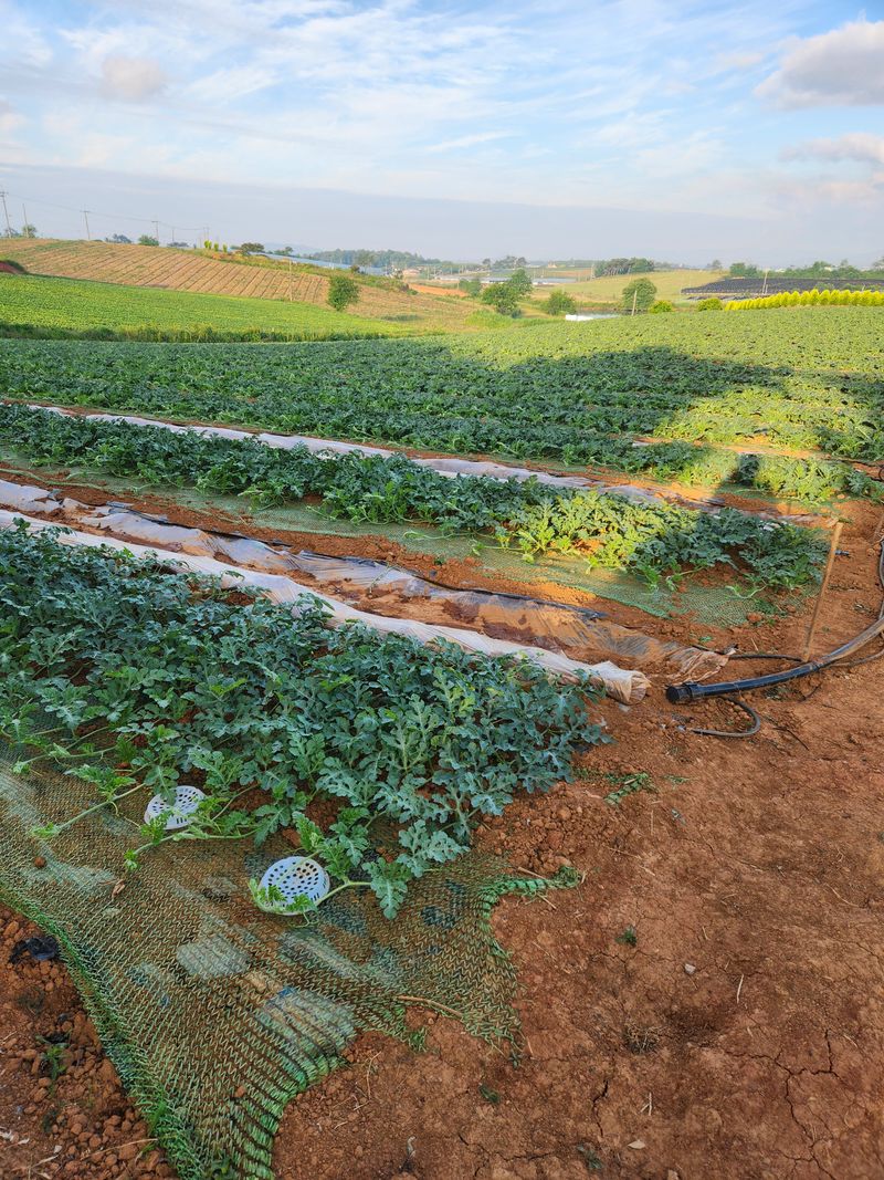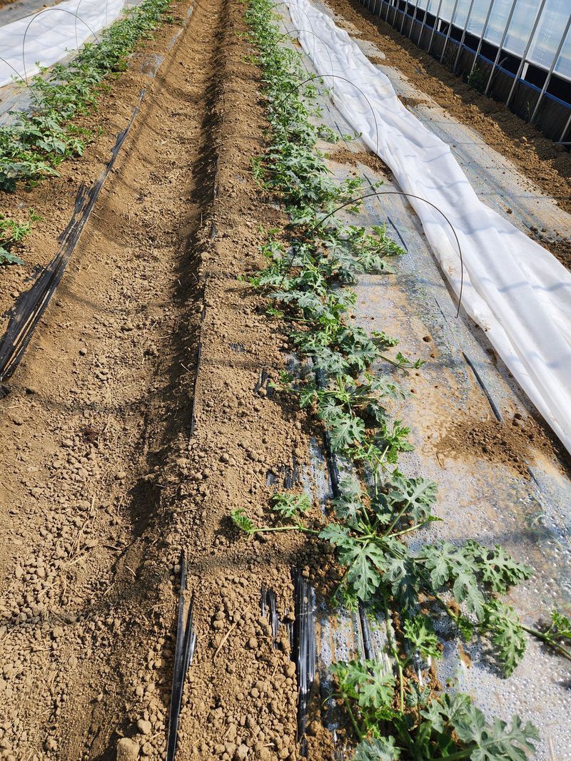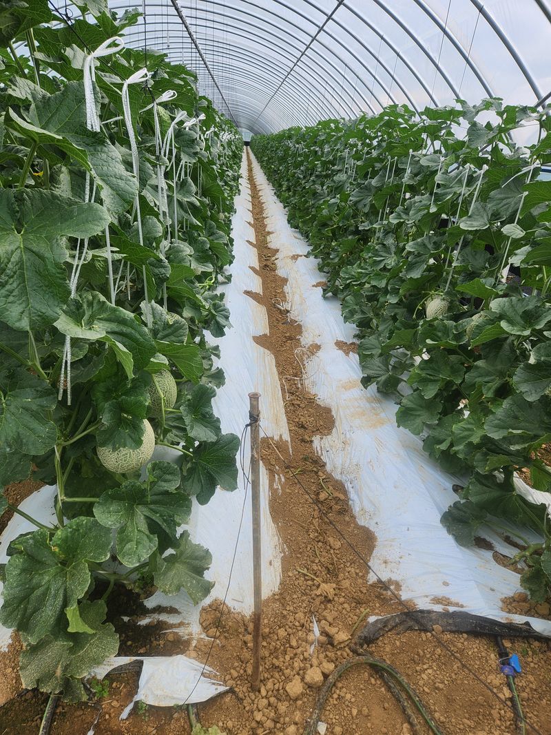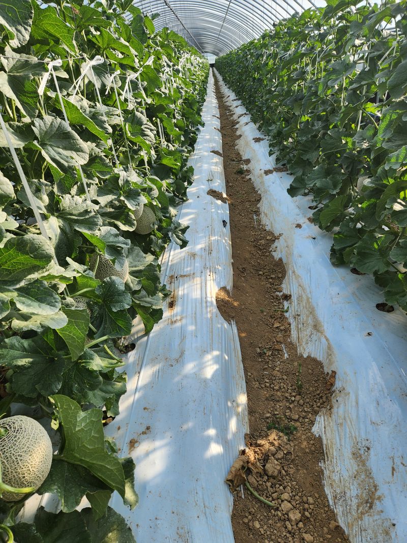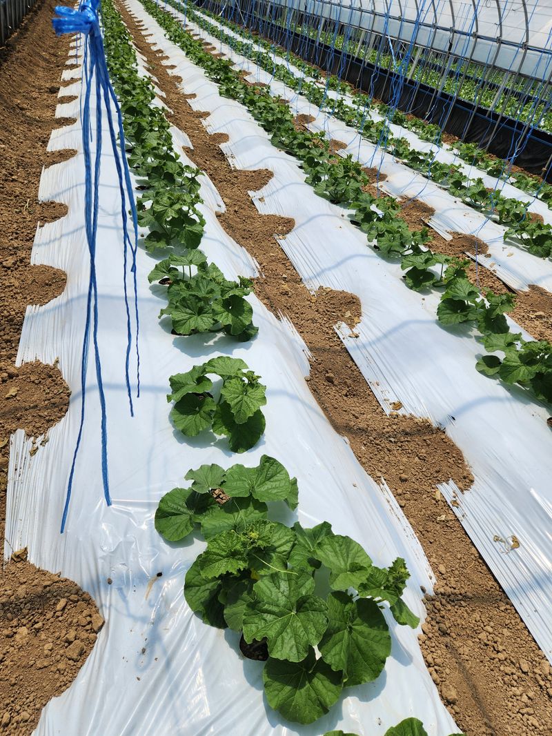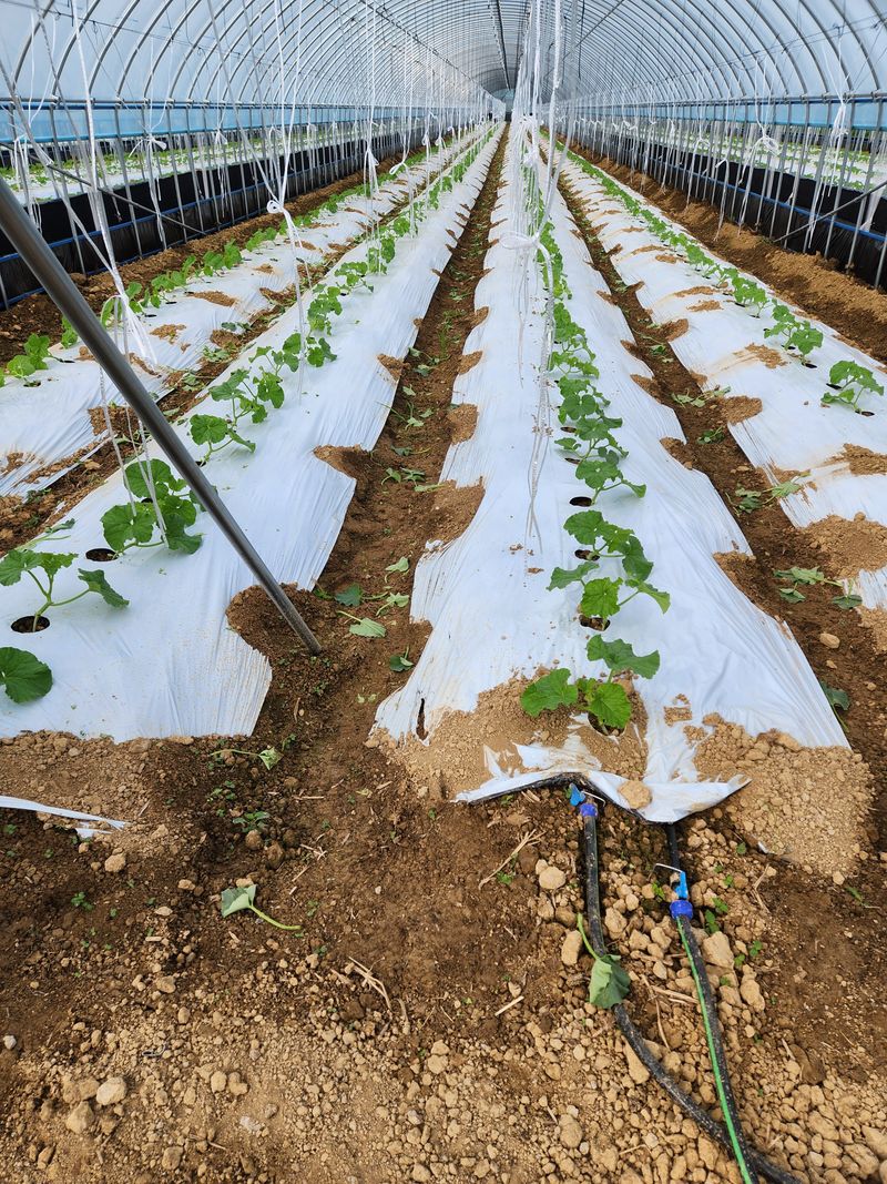 1차메롱 3번째 순감으면서 12잎.13잎 측지 빼기. 노지수박밭 고랑 비닐걷고 순.그물망 제거작업