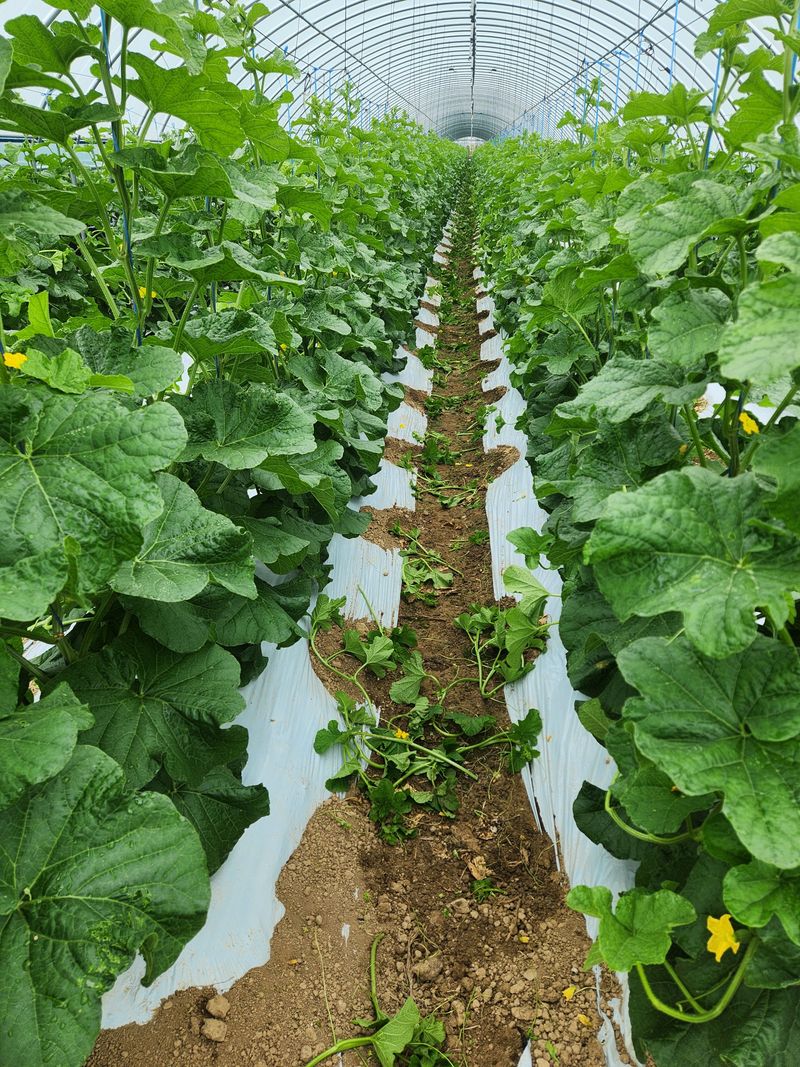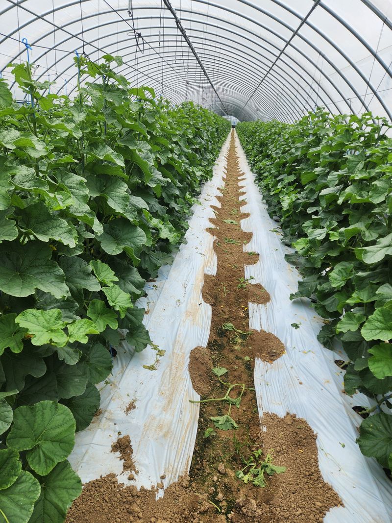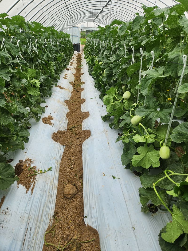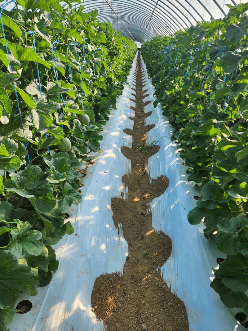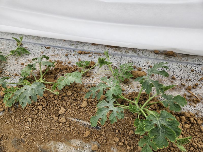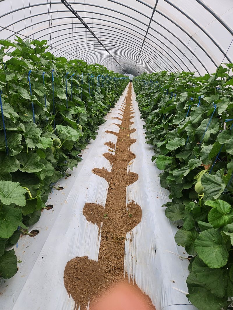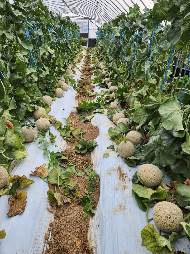 1차메롱 3번째 순감으면서 12잎.13잎 측지 빼기. 노지수박밭 고랑 비닐걷고 순.그물망 제거작업