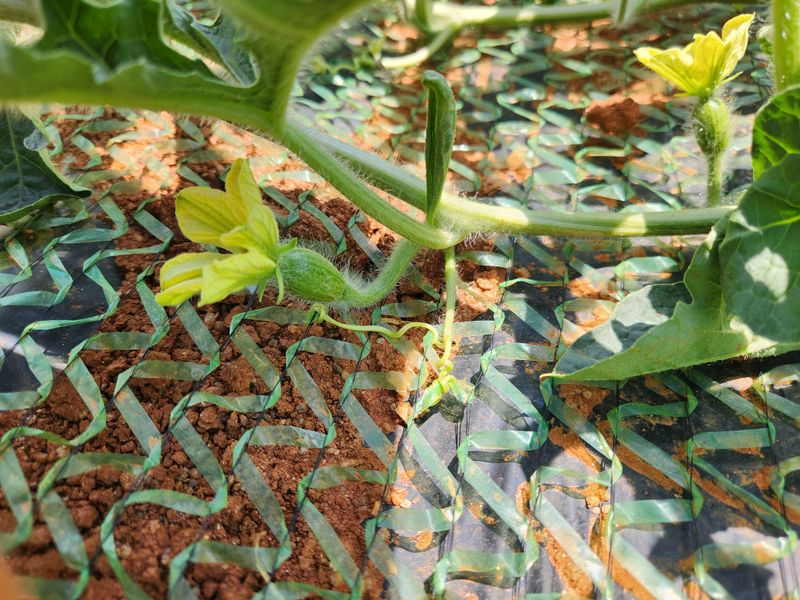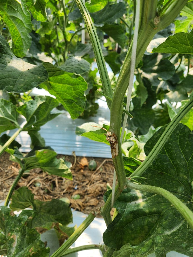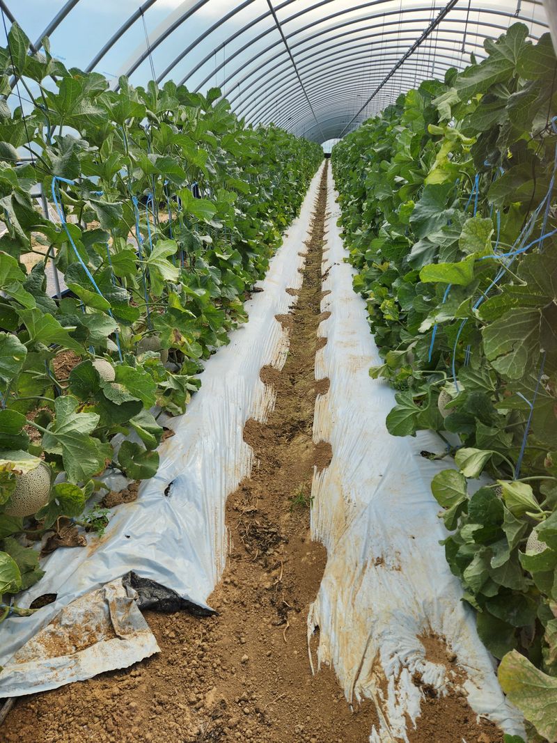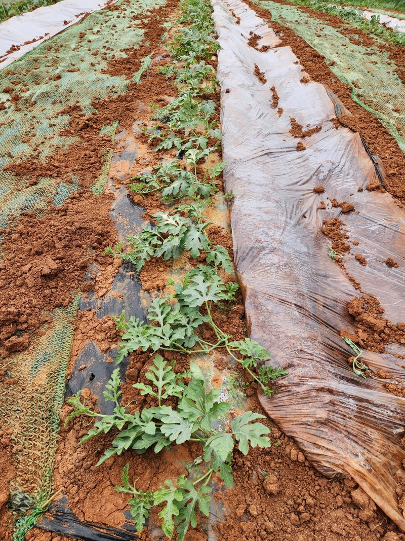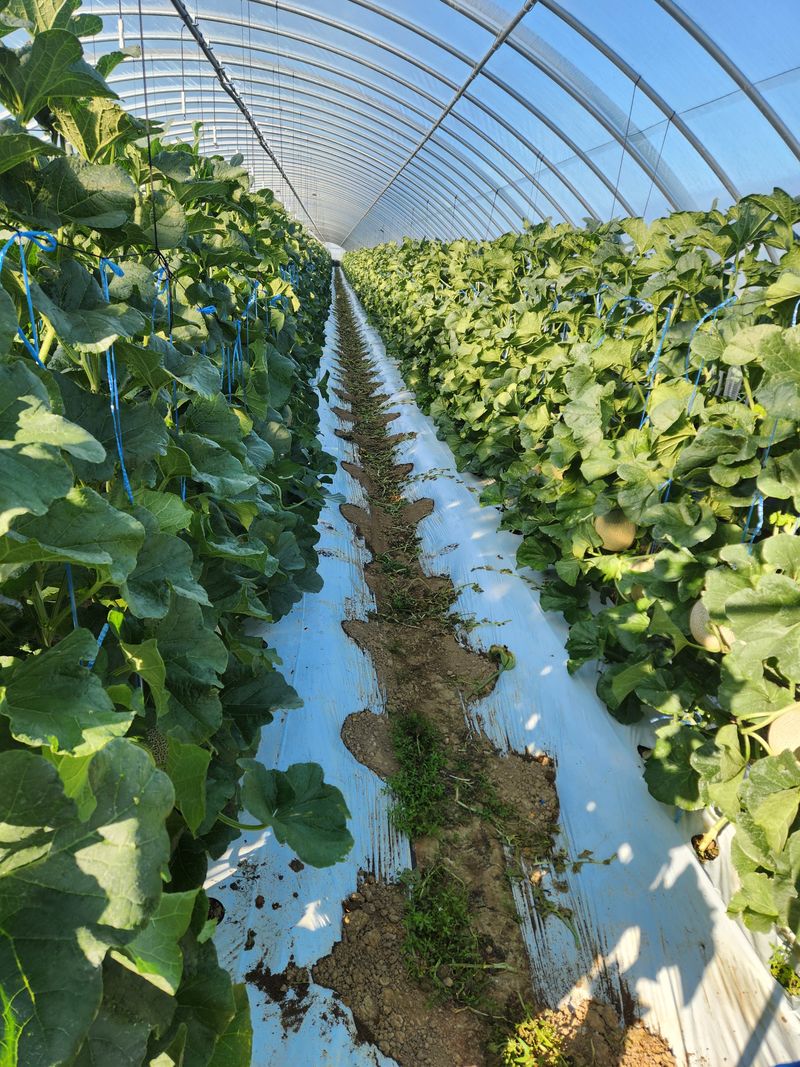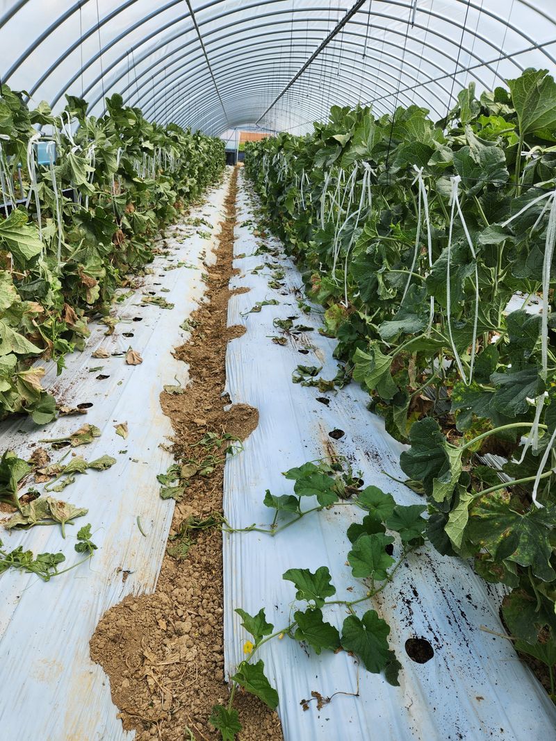 1차메롱 3번째 순감으면서 12잎.13잎 측지 빼기. 노지수박밭 고랑 비닐걷고 순.그물망 제거작업