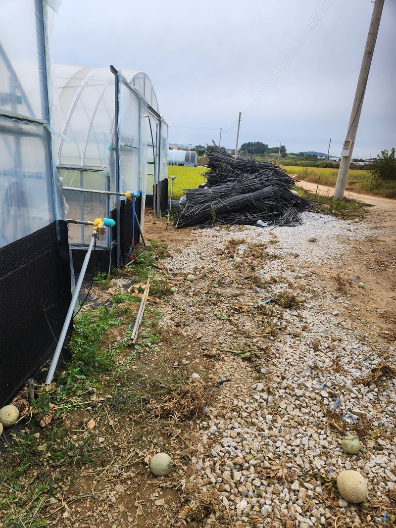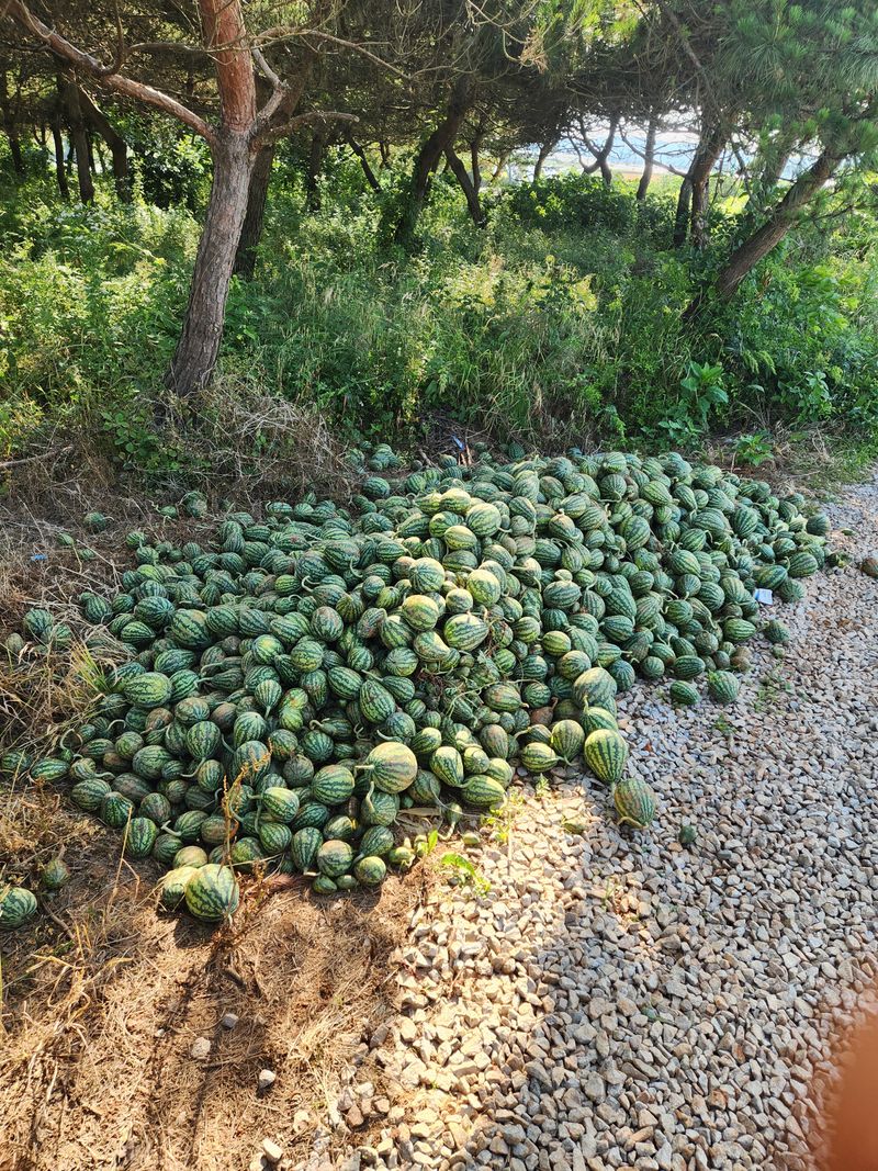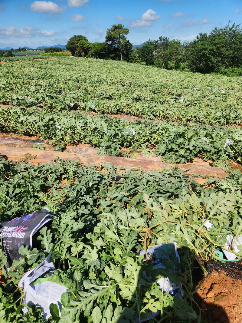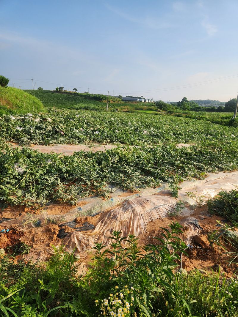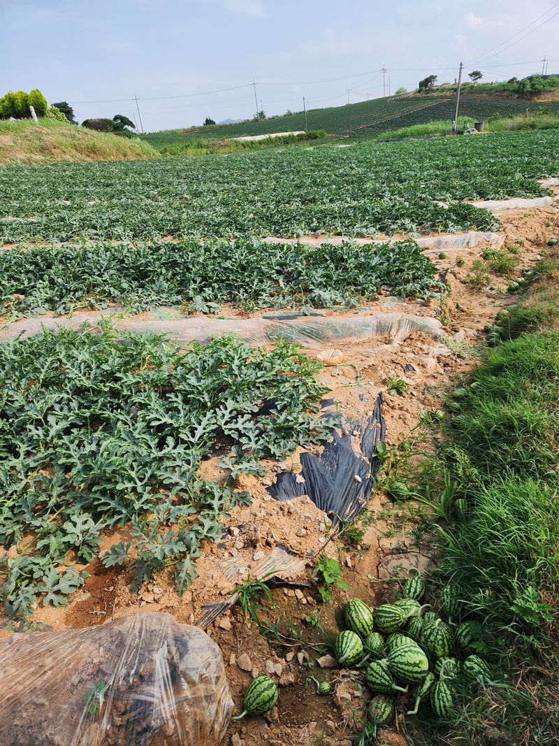 2차 메롱 정식 6동. 노지수박 작업끝나서 수박받침 모으고 수박 목아지 낫으로 치기작업 폭염으로 피수박 대량발생
