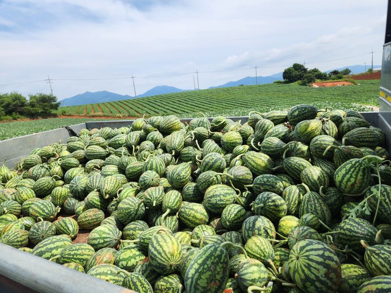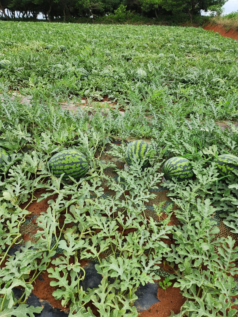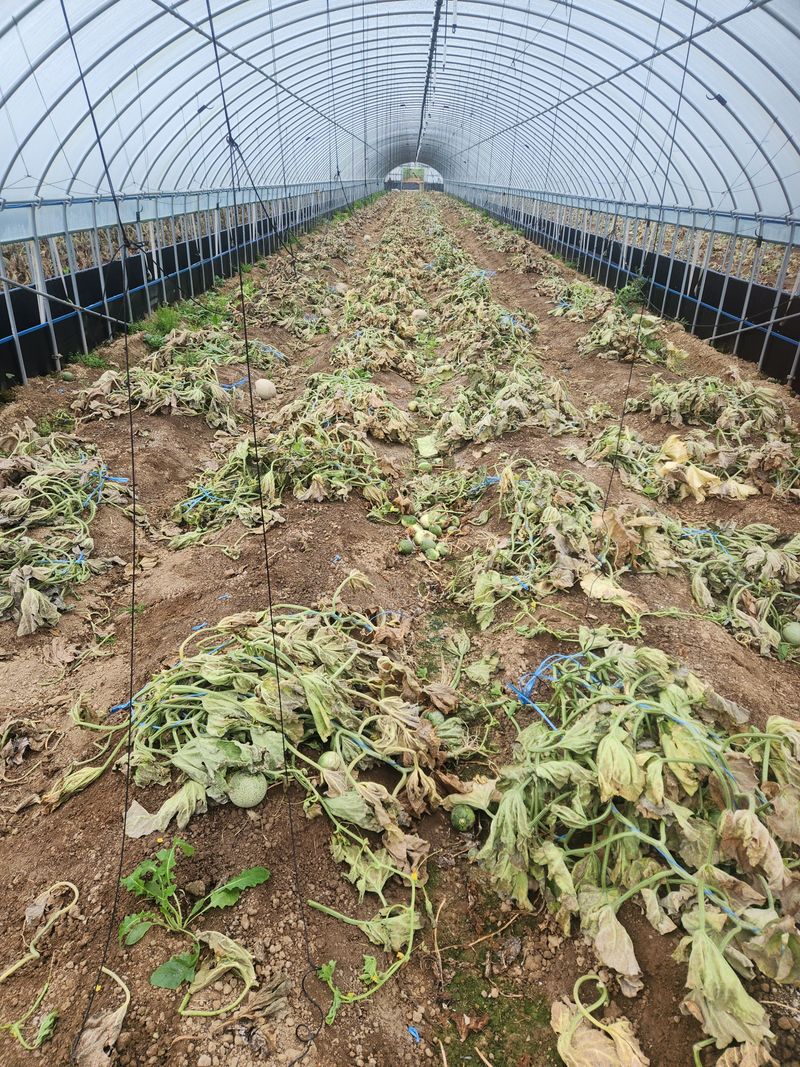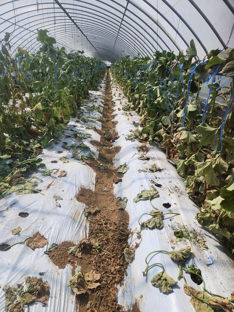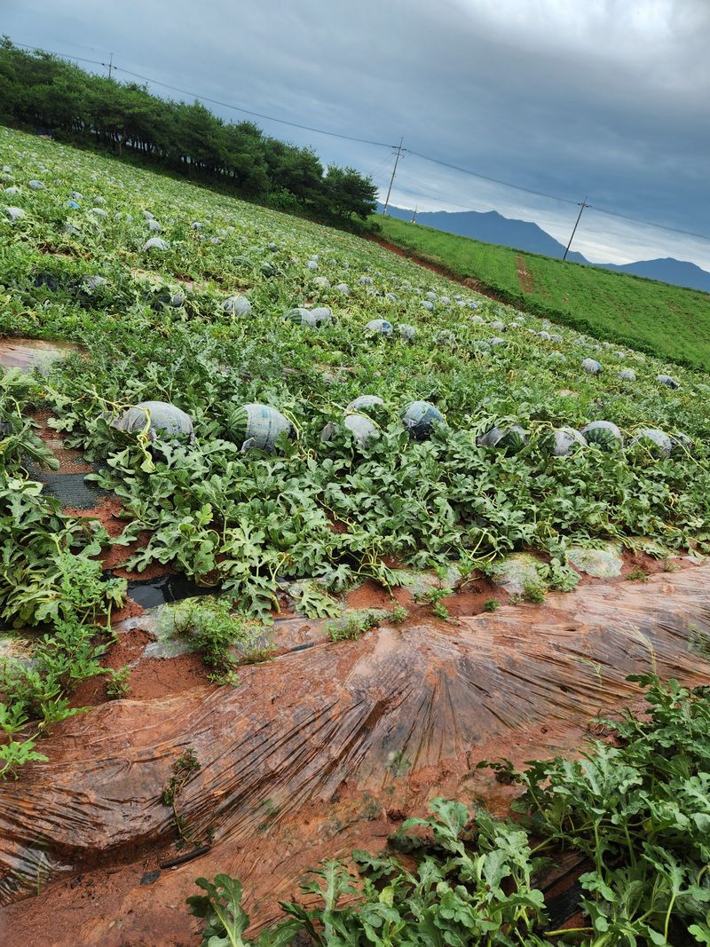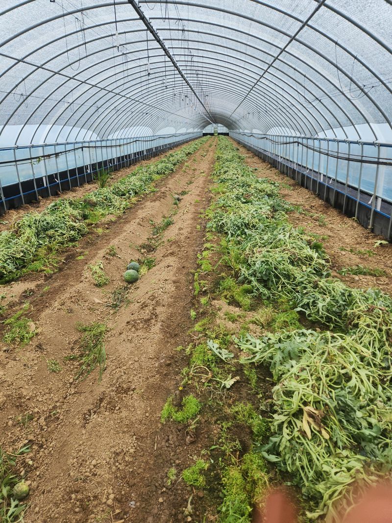 2차 메롱 정식 6동. 노지수박 작업끝나서 수박받침 모으고 수박 목아지 낫으로 치기작업 폭염으로 피수박 대량발생