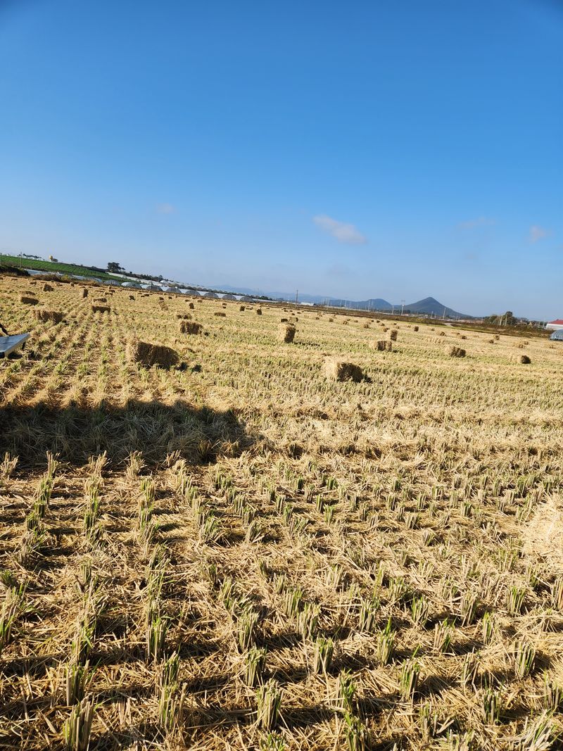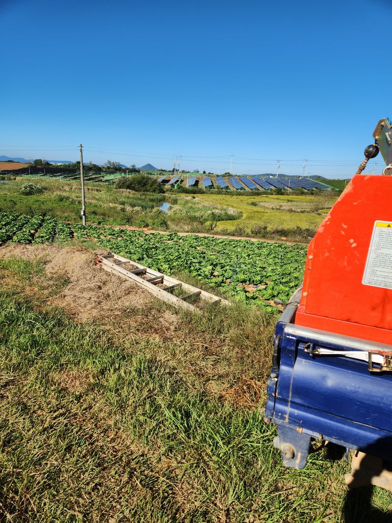 논에 벼 수확하고 장비이용해서 지프락 묶은것 밭으로 옮기기 작업및 배추밭 물주기 작업