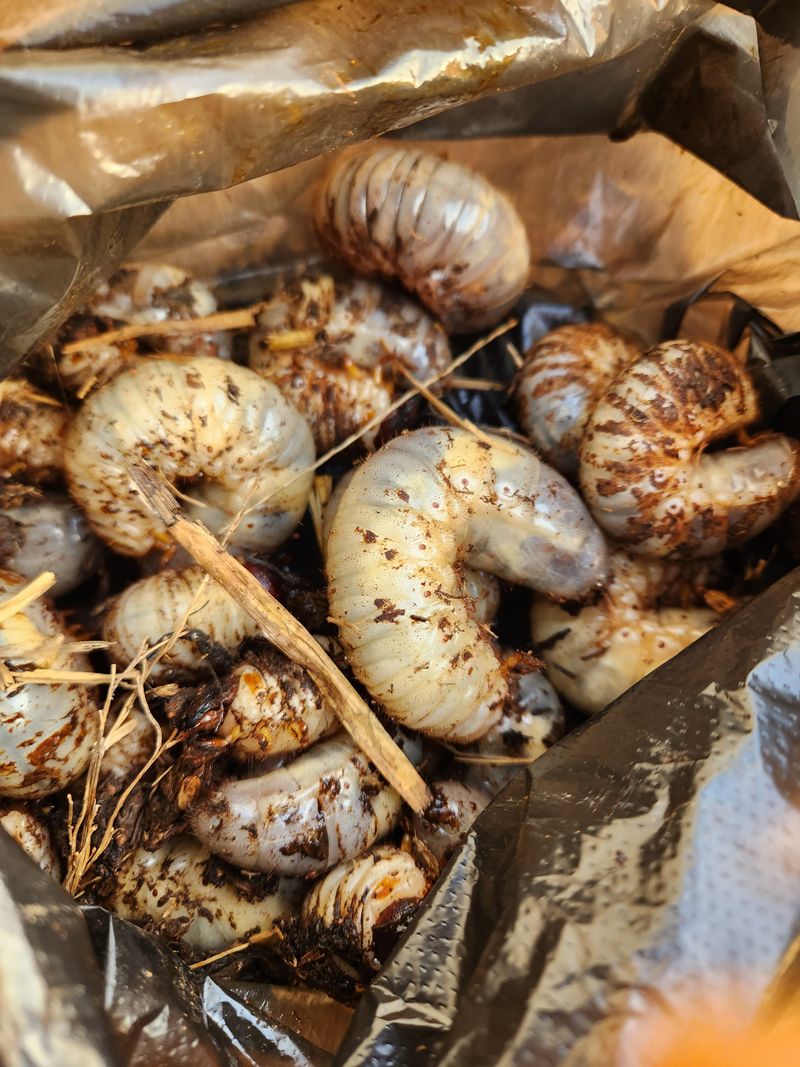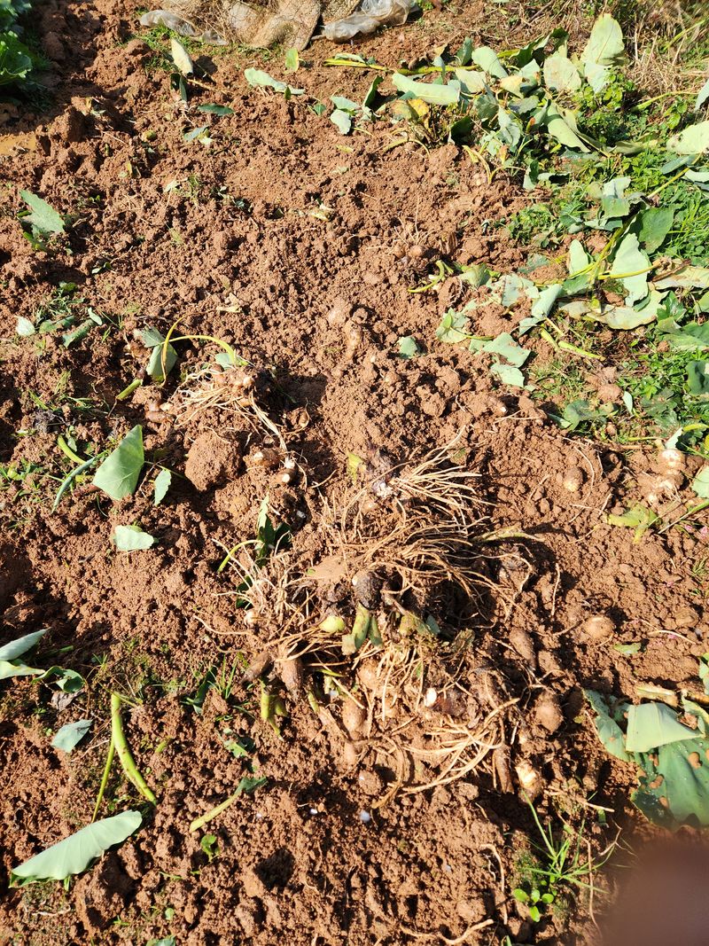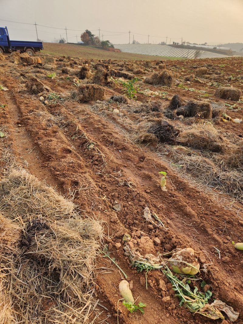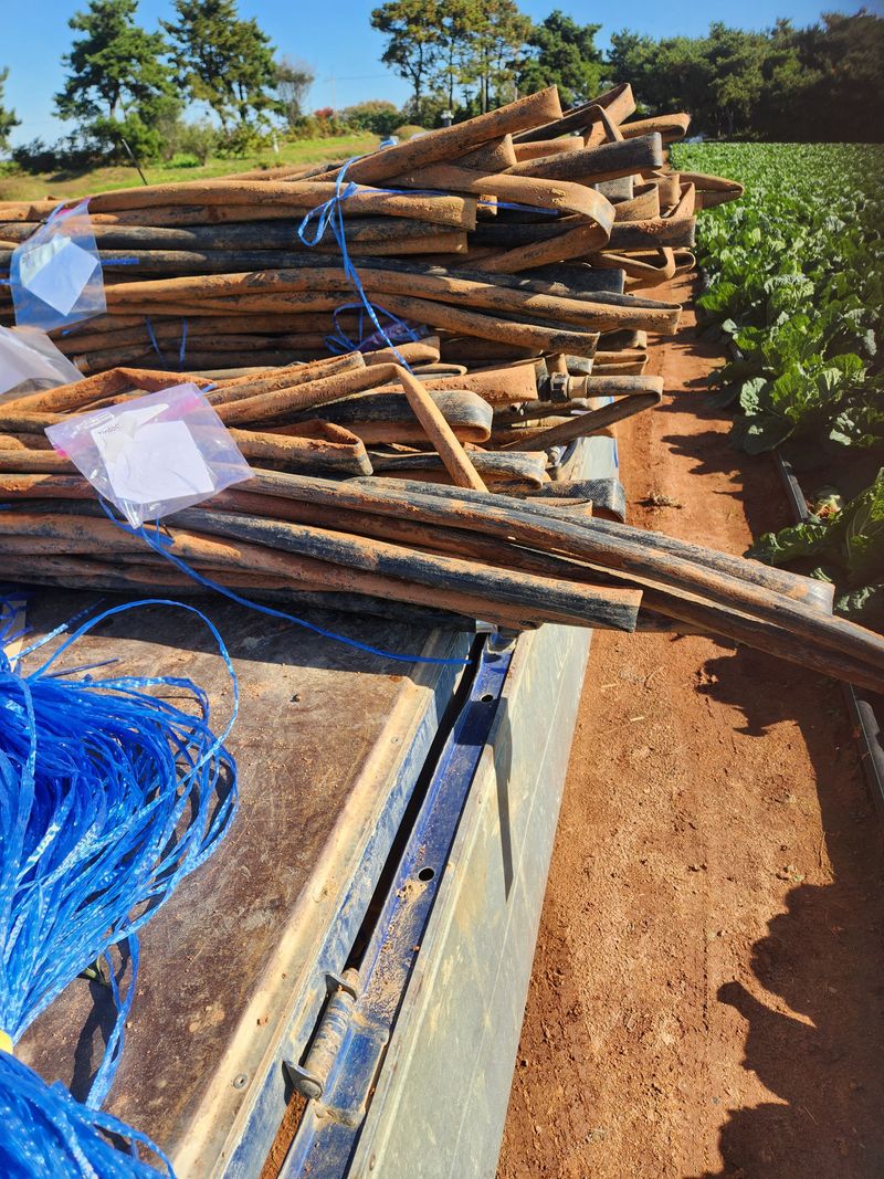 무시밭 비니루 걷기작업 완료.배추밭 생육상태 점검 지푸라기 밭에 깔고. 지푸라기 밑에 굼벵이 큰것 몇마리 잡아서 아버지 기력 보충용 으로 잡아서 드림.