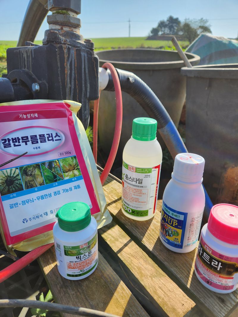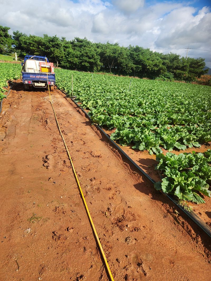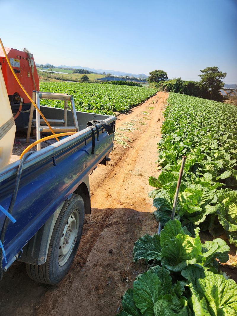 오늘 오전에 무시밭2600평.배추밭500평 농약 살포작업. (살균제.무름병,노균병.살충제. 고자리. 성장억제제.)