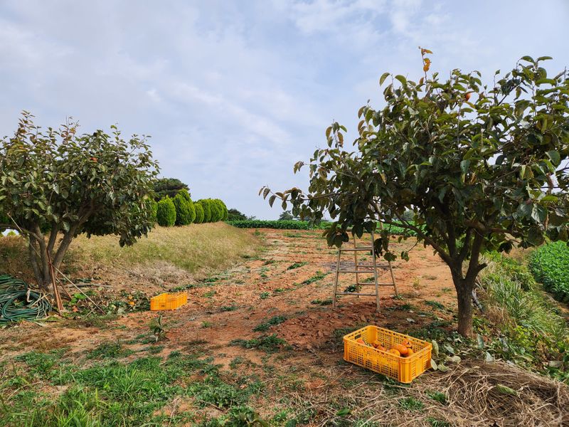 무시밭 일부 스프링쿨러 해체작업및 단감나무 에서 까치밥 남겨두고 감따기작업, 배추밭 둘러보면서 눈에 보이는 달팽이 잡아서 죽이기 작업.