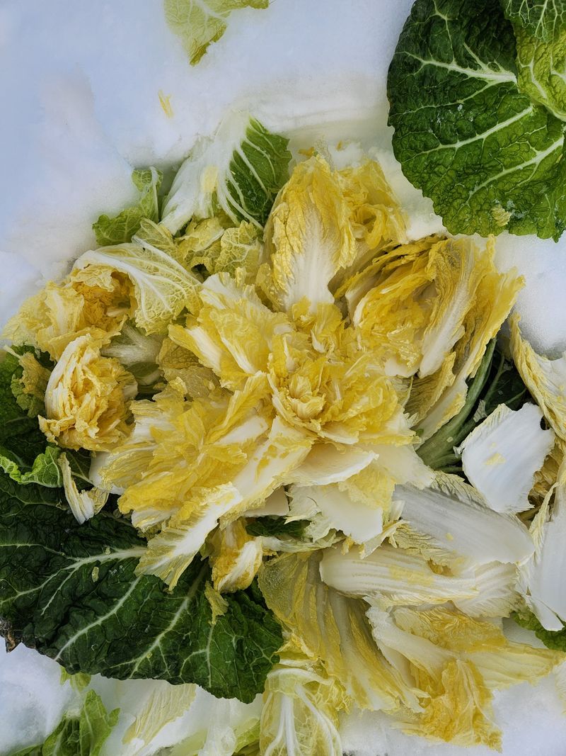 날이 풀려서 눈속에 파묻힌 배추밭 점검. 한포기 손으로 짜개보니 배추속은 나쁘지 않는것 같음. 뜯어서 씹어 먹어 보니 고소하고 달짝지근 함