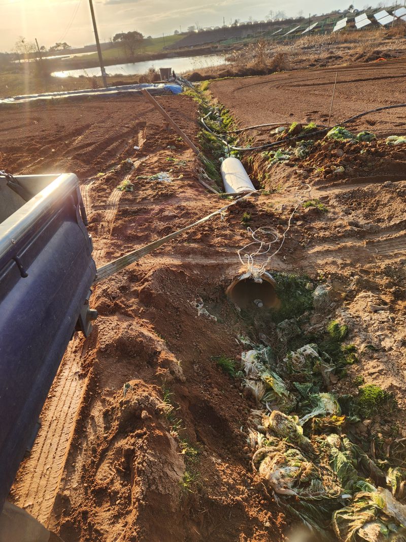 오전에 소형건설기계 농업용 굴삭기 3시간 실습하고 오후에 무시밭 관수시설 철거작업및 배추밭 둘러보기.