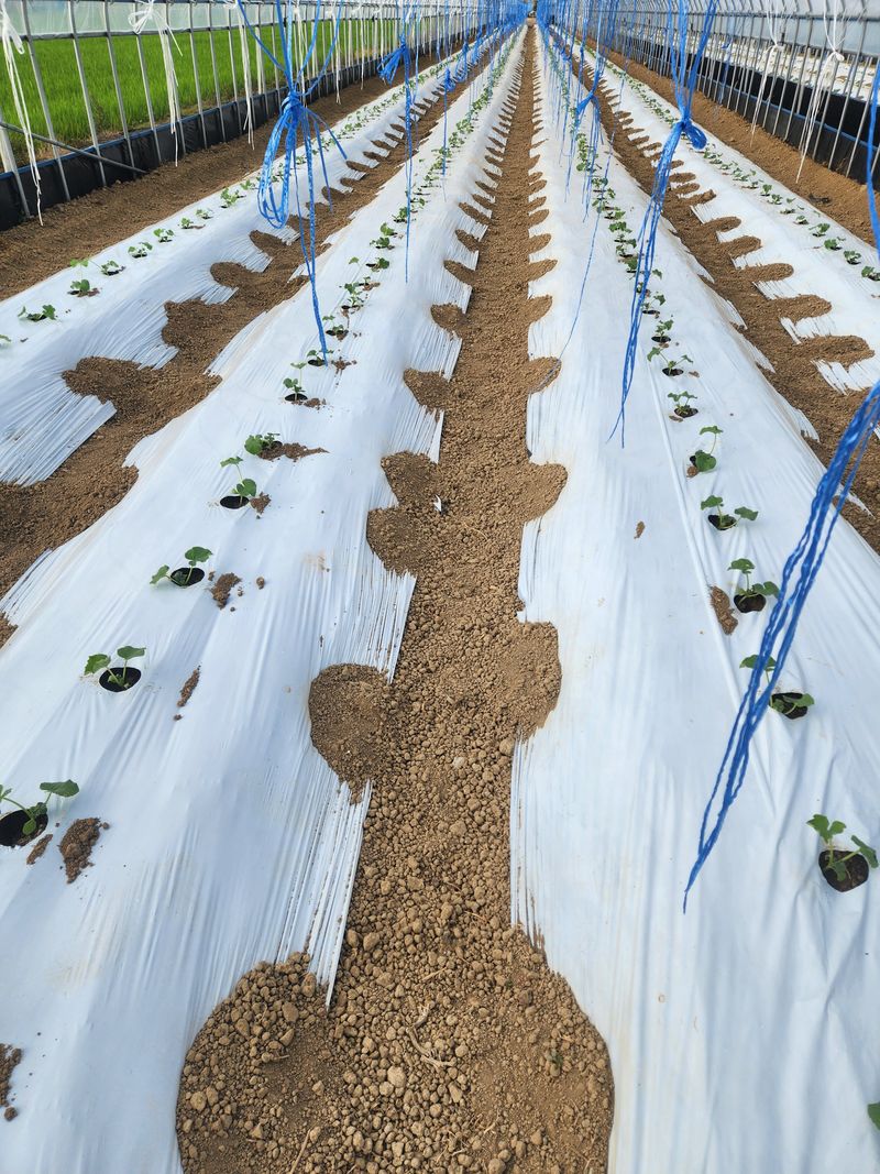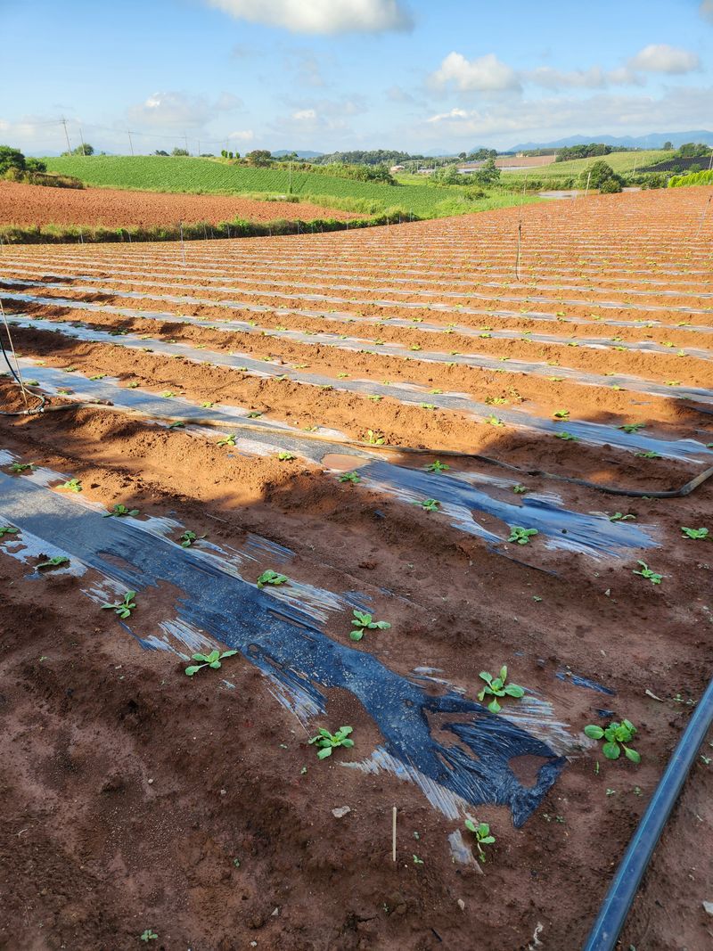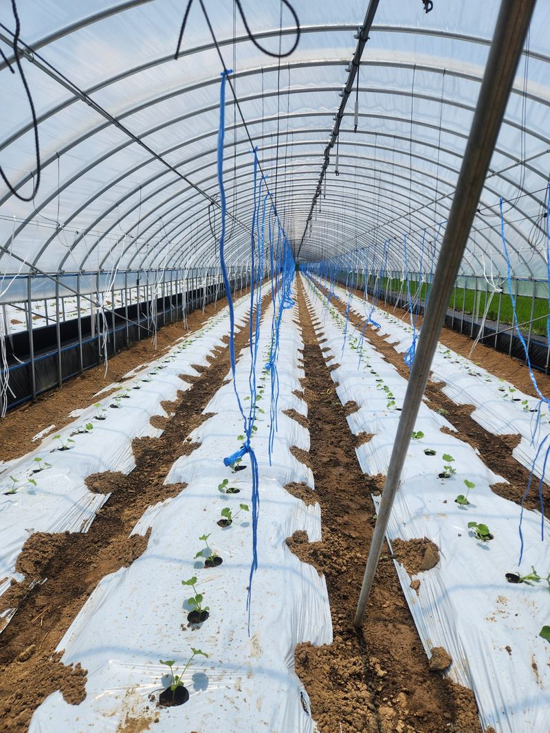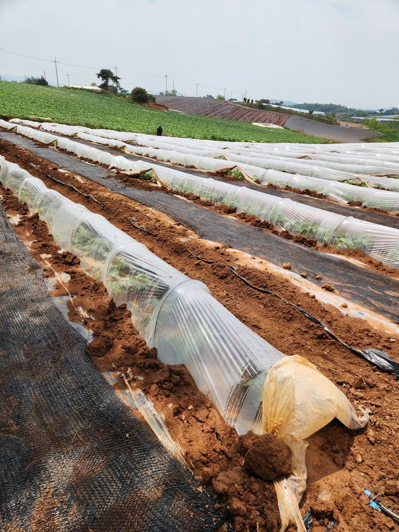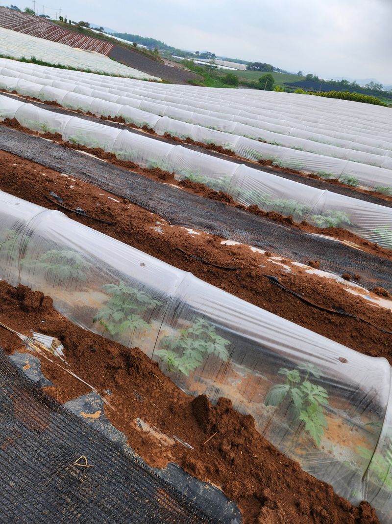여자네명 투입해서 2차 정식 메롱 기어다니다 벌떡세워서 유인줄에 감아주기 작업 1차 수정벌 넣기전 농약살포작업
