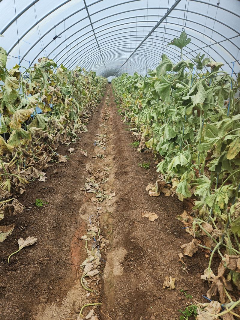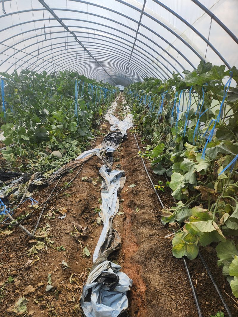 나머지 7동 메론메달린끈 해체하고 바닥 비닐 점적호수 철거작업 설거지 끝난 7동 메론끈 하우스 천정으로 올리기작업 남자두명투입