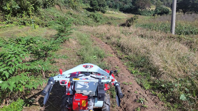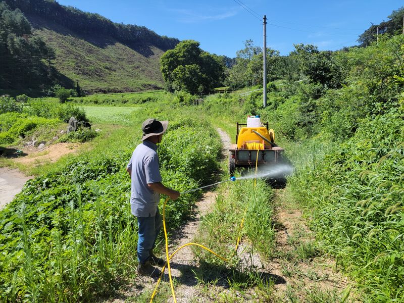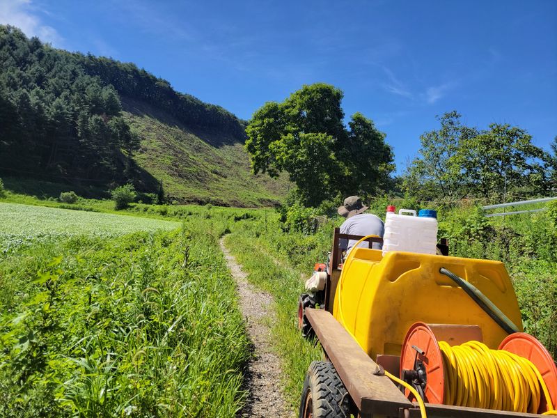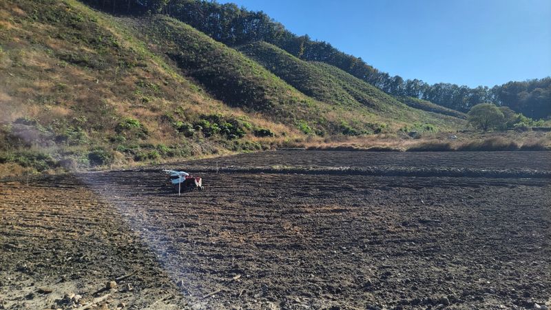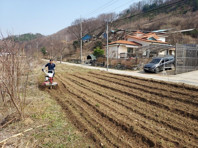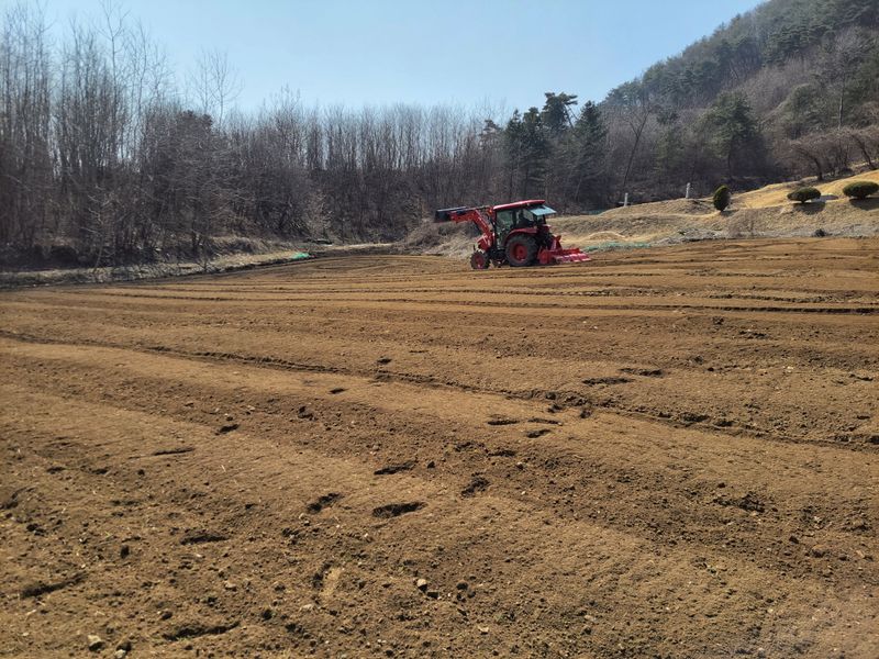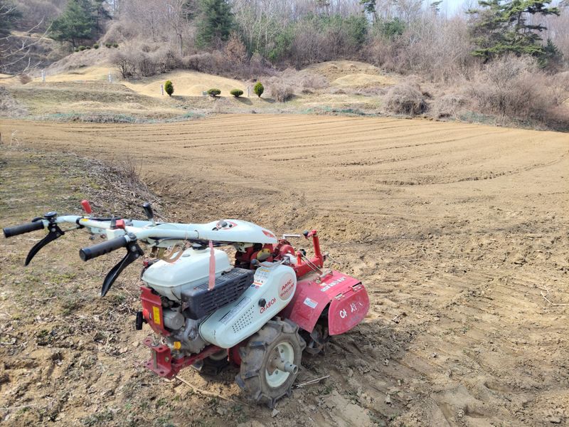 새로 조성할 밭입니다. 풀이 무성해 트랙터는 고사하고 포크레인 작업도 힘들어 보이는데요. 어쩔수없이 경운기를 동원해 풀약을 합니다. 동네사람들 도움 덕분입니다. 1200평 비어 있는 밭, 예초기 작업과 등짐 분무기로는 엄두가 나질 않더군요.