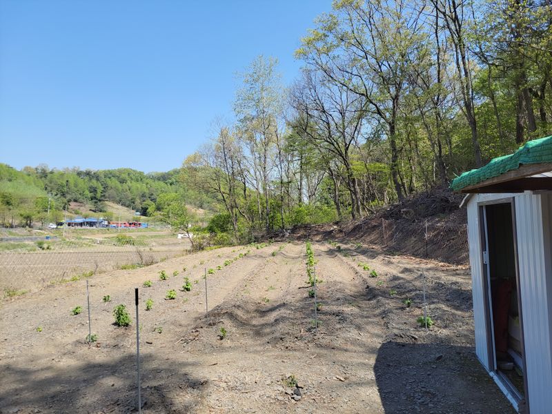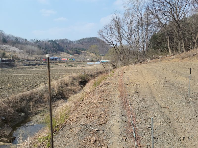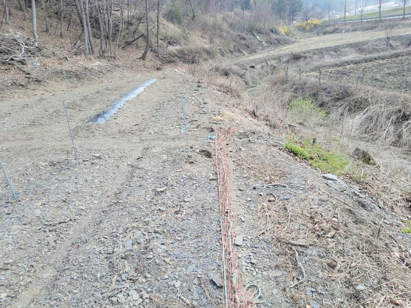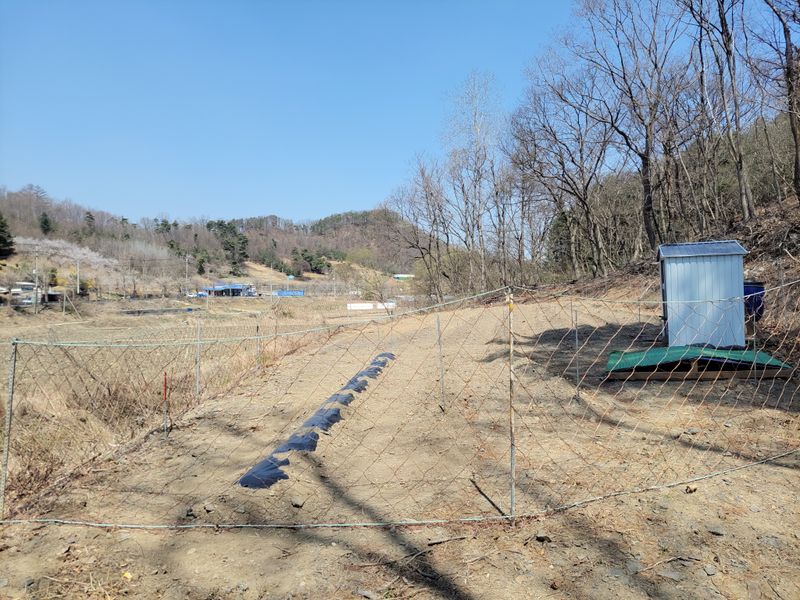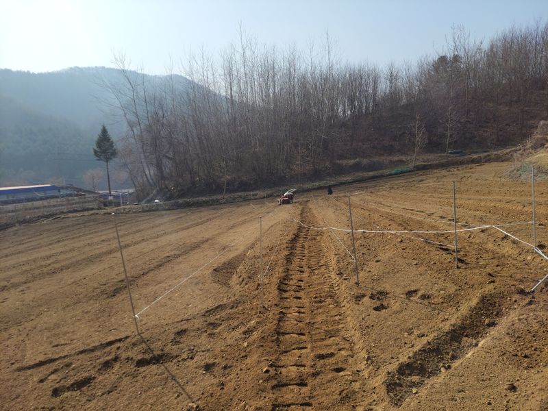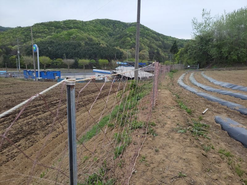 너른 밭 고라니 망을 치기 시작했습니다. 공동구매 주문한 해태망이 아직 도착하지 않아 급한대로 한쪽만 쳤네요. 땅을 헤집고 올라오는 엄나무 순을 보호하기 위해ᆢ