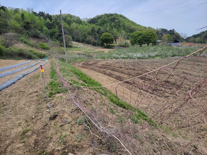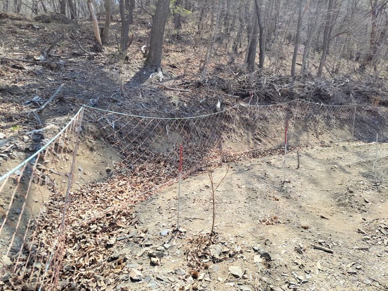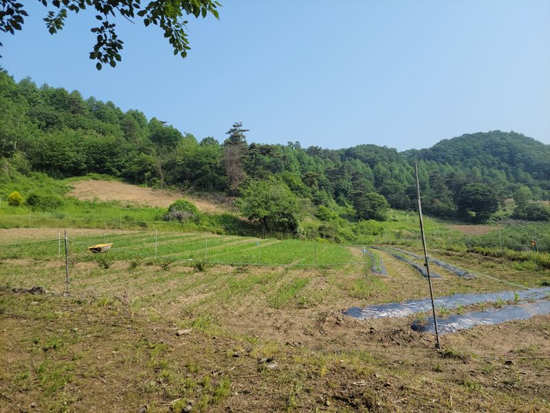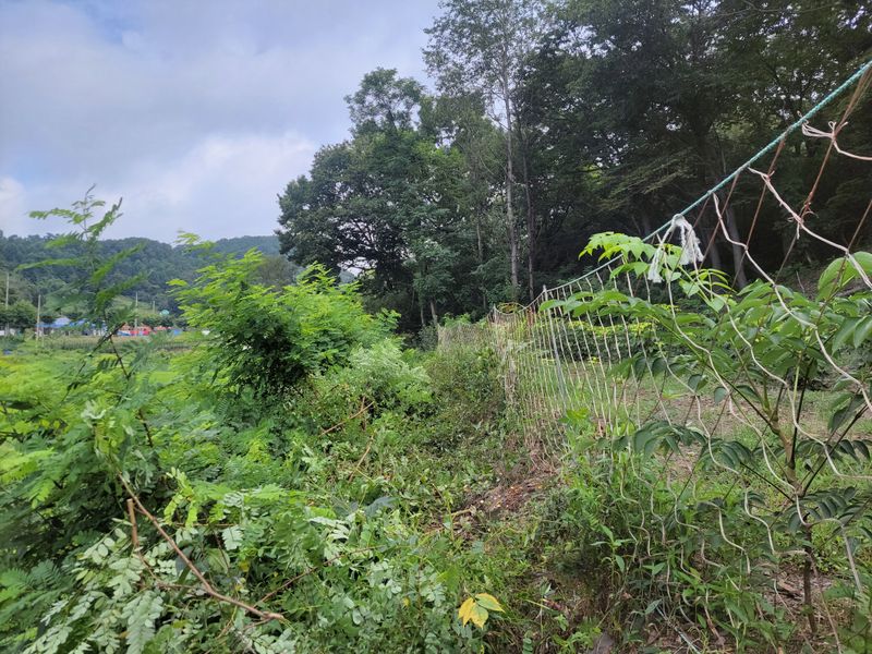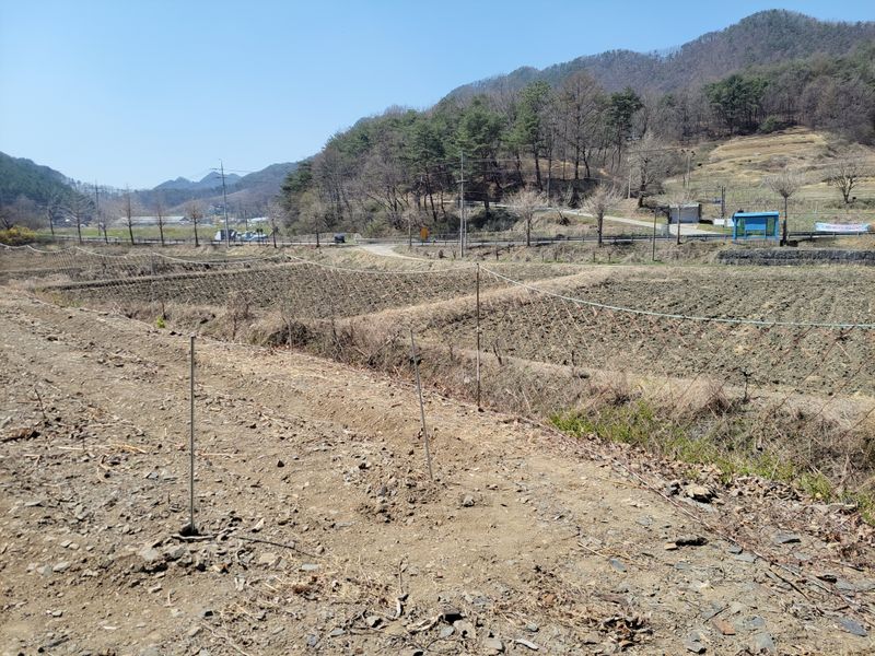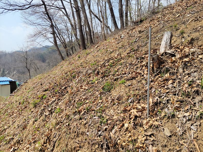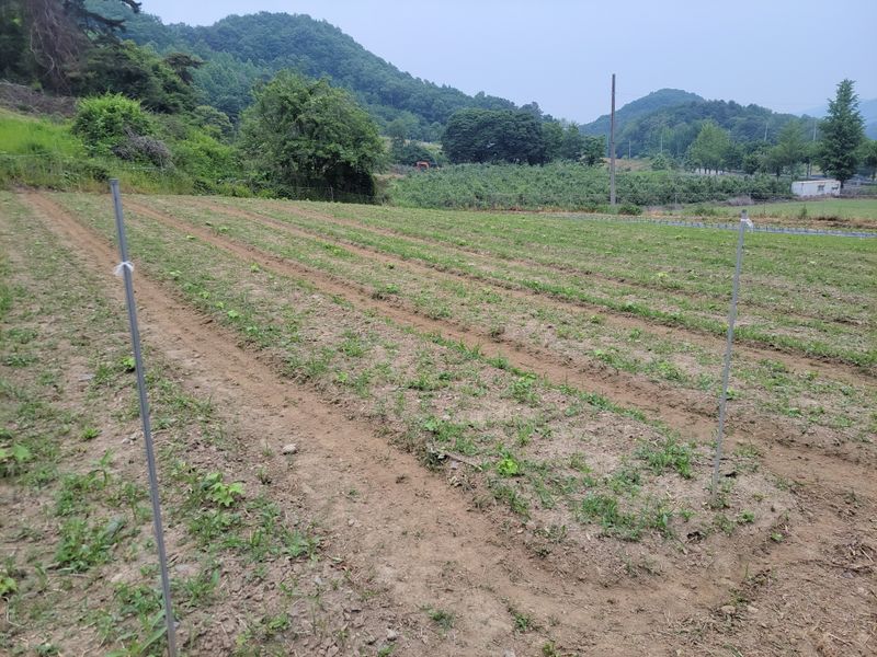 너른 밭 고라니 망을 치기 시작했습니다. 공동구매 주문한 해태망이 아직 도착하지 않아 급한대로 한쪽만 쳤네요. 땅을 헤집고 올라오는 엄나무 순을 보호하기 위해ᆢ