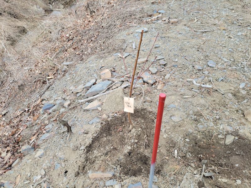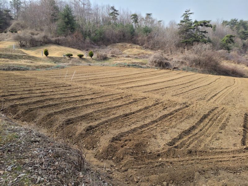내일과 모레 영하 4~5도까지 떨어진다 하여 본밭엔 엄나무 종근 심을 엄두도 못내고ᆢ 농막 앞에 고추 오이 등 푸성귀 심을 두둑하나 만들고, 엄나무밭 한쪽엔 복숭아나무 6주를 심었습니다. 잘 커주기를 바라면서ᆢ