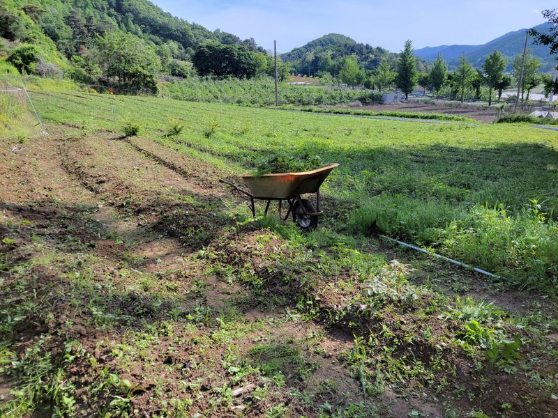 엇그제 애플참외 넝쿨 걷어낸 자리엔 배추를 더 심어 늧은 가을을 기약합니다. 새로 조성하는 밭엔 자갈보다 더 큰 돌을 받고 풀을 깎았습니다. 마치 농사의 절반은 풀과의 영역 다툼처럼 느껴집니다.