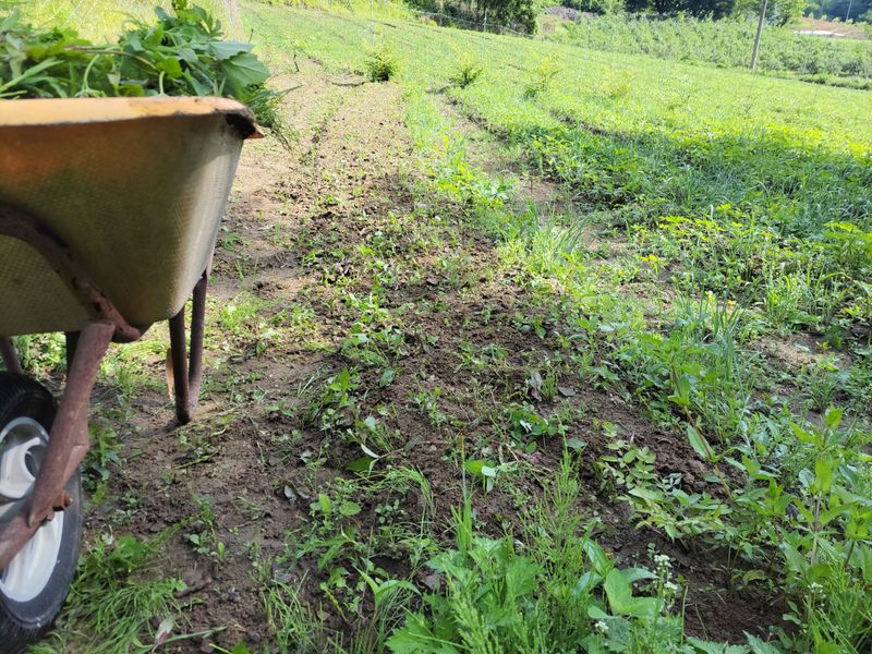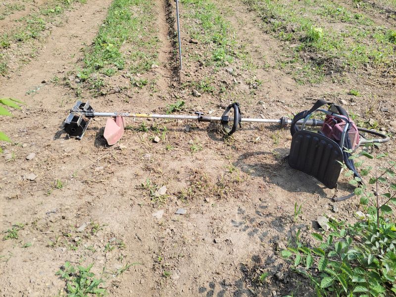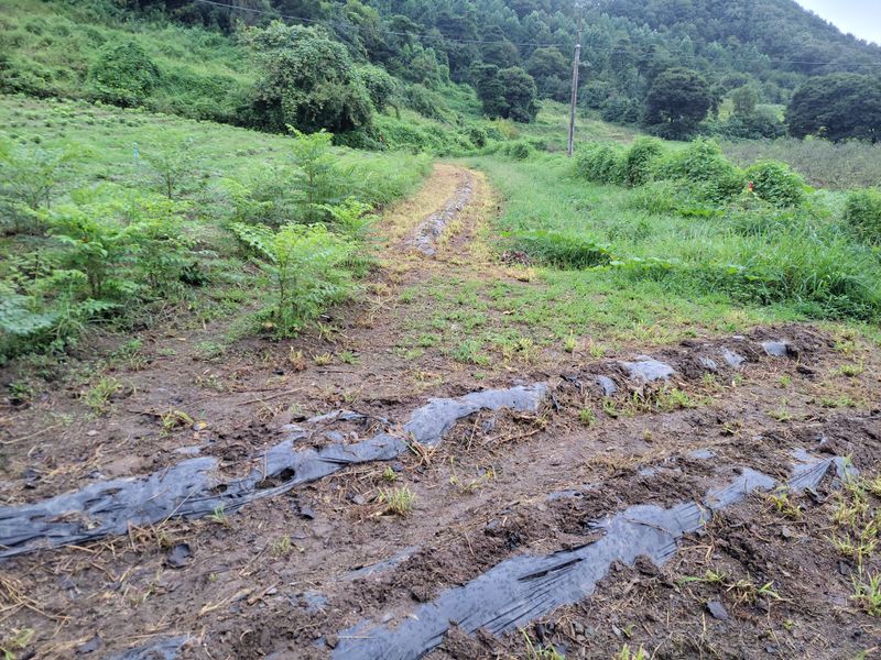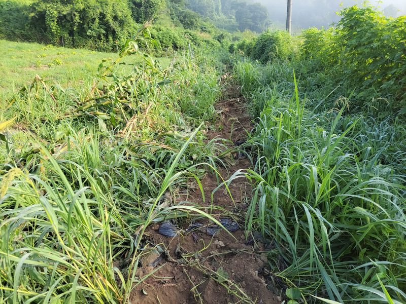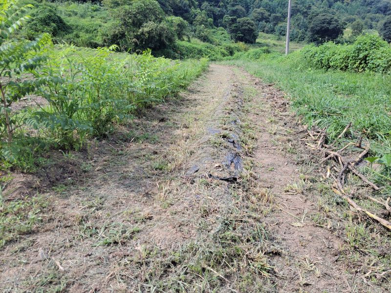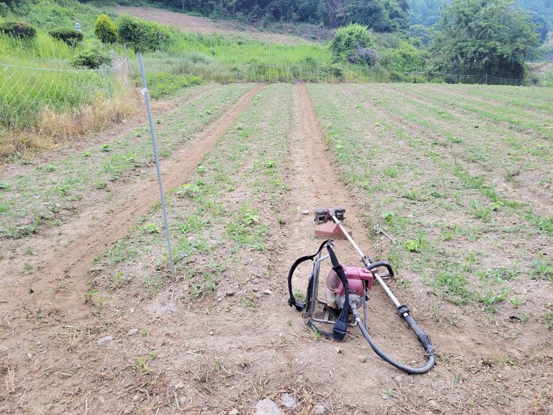 4월에 엄나무 종근 심은 밭, 잘 올라온 친구들 있는 반면 이제 순을 올리려 애쓰는 친구들도 있습니다. 지난 며칠 내린 비에 물길이 생겨 제초작업 겸 고랑을 팠습니다. 예초기에 달아 쓰는 이것ᆢ 팔 빠지게 엄청 무겁네요.