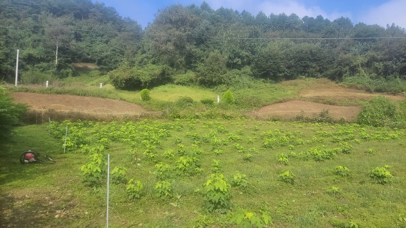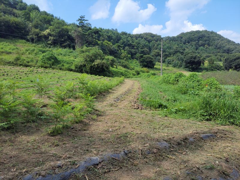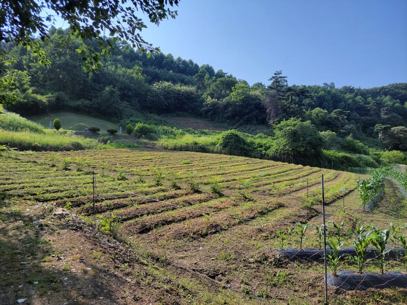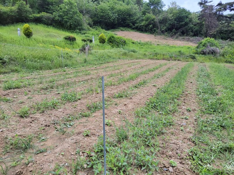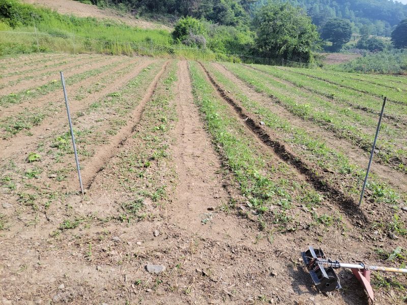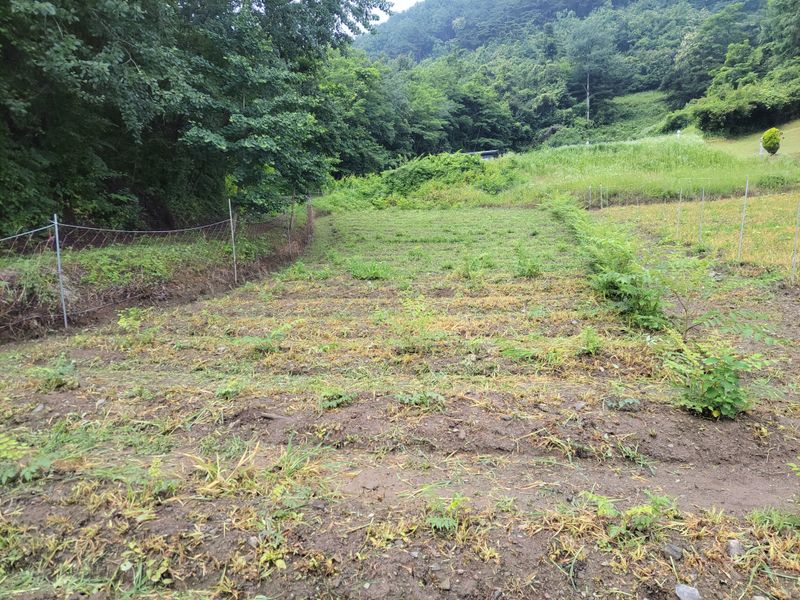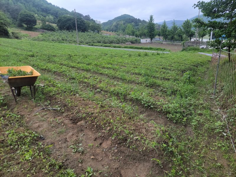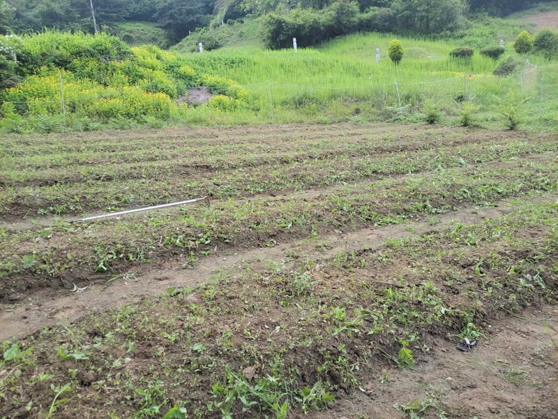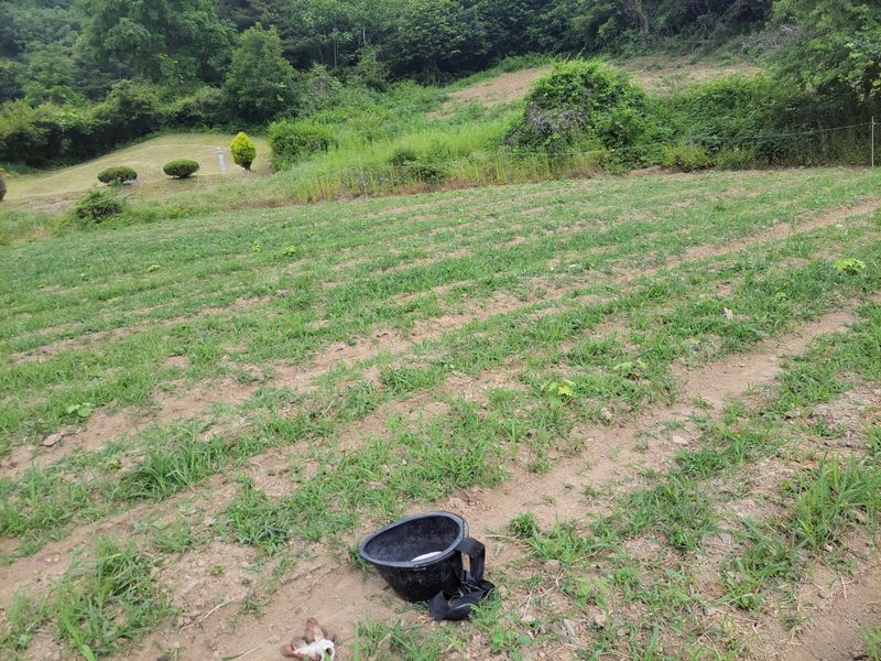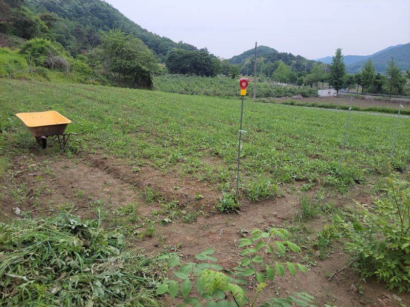 너른 밭 고랑 정리 작업 중입니다. 일단 물고임 발생, 흘러내린 흙들 정리하고 예초기에 장착한 제초기로 평탄작업을 했지만ᆢ 장마전에 구글기로 좀더 고랑을 깊이 파야 할듯하네요. 엄나무들 너무 어려서ᆢ