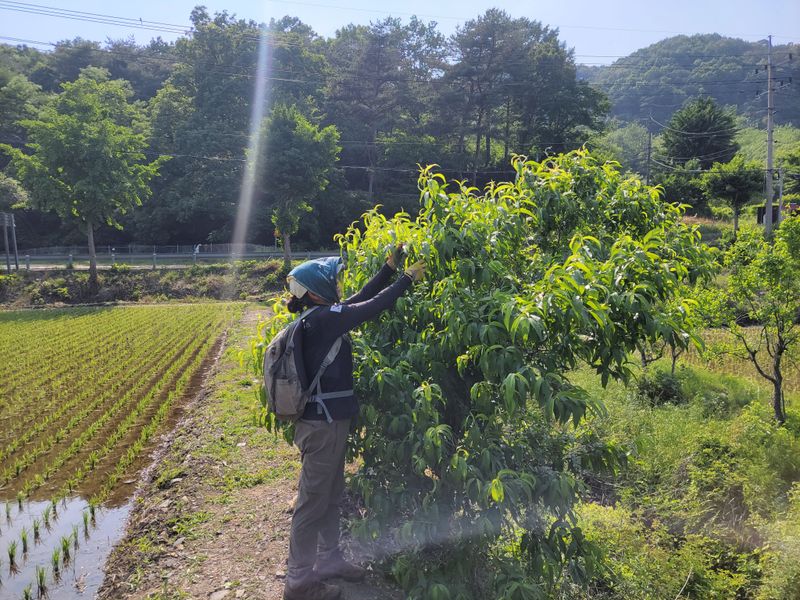 엄나무 밭에 해태망을 치다 말았네요. 준비해간 지줏대가 너무 얕아서 내일 사이즈 긴걸로 준비해서 마무리하려 합니다. 마지막 사진은 지난주 밭 가에 심은 복숭아나무 꽃망울입니다. 언제 꽃을 피워도 이상치 않은 봄날씨, 만끽합니다.