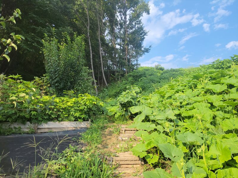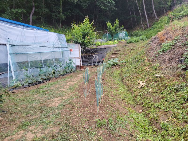 며칠 비운새 호박에게 점령 당한 농막, 엄나무밭 울타리는 아까시나무들로 무성합니다. 역시 풀과의 전쟁은 계속되고 겨우 시간 내어 쪽파 한 두둑 심었습니다.