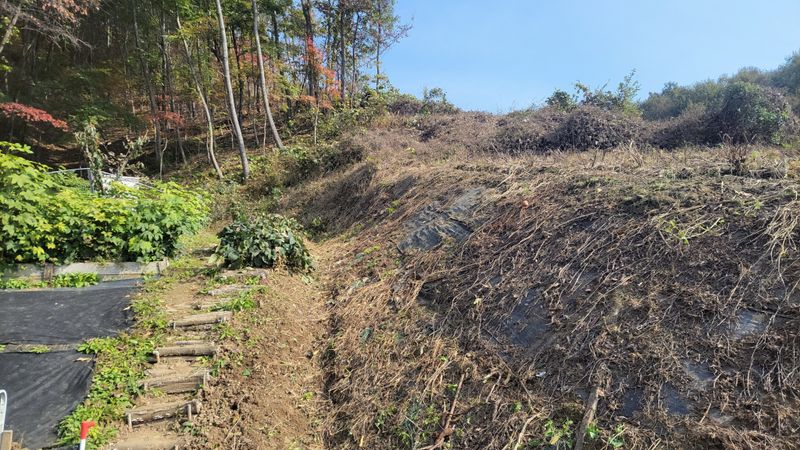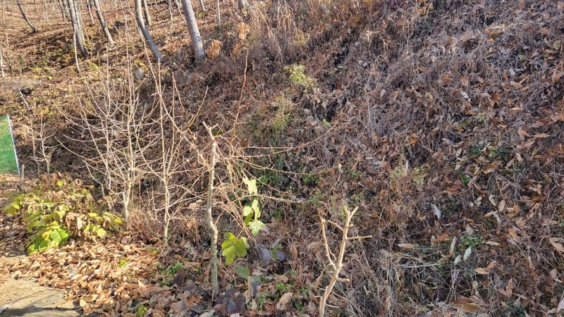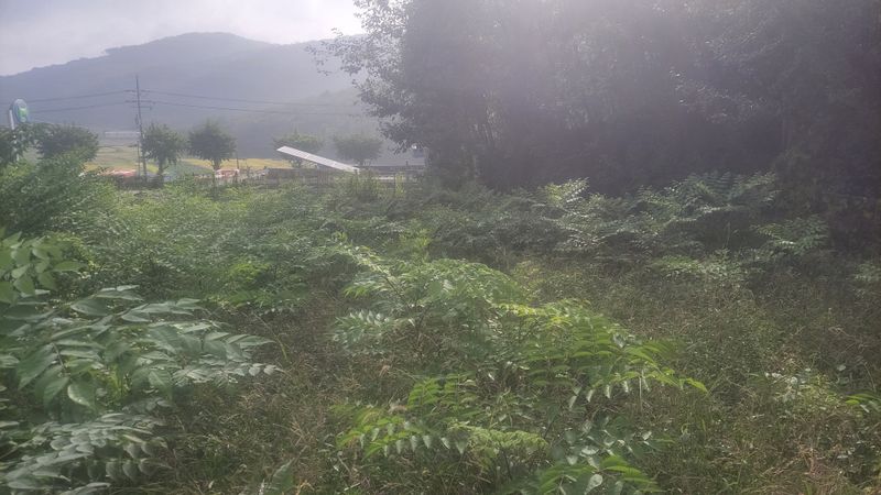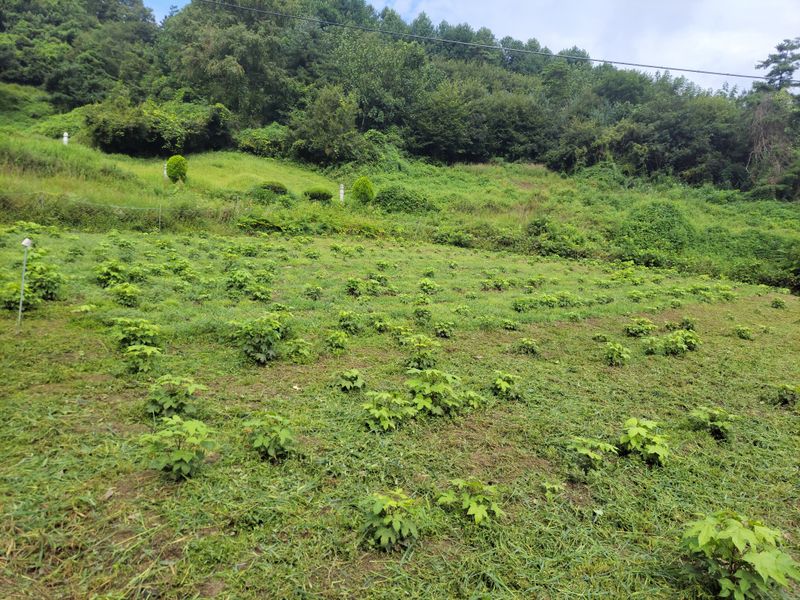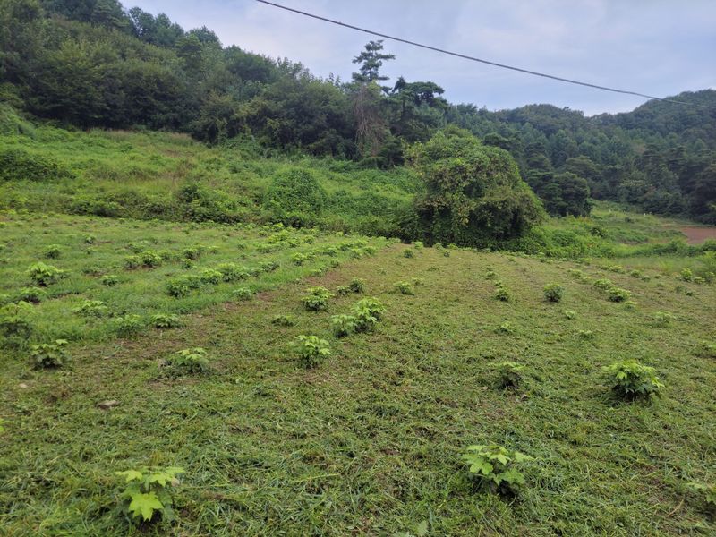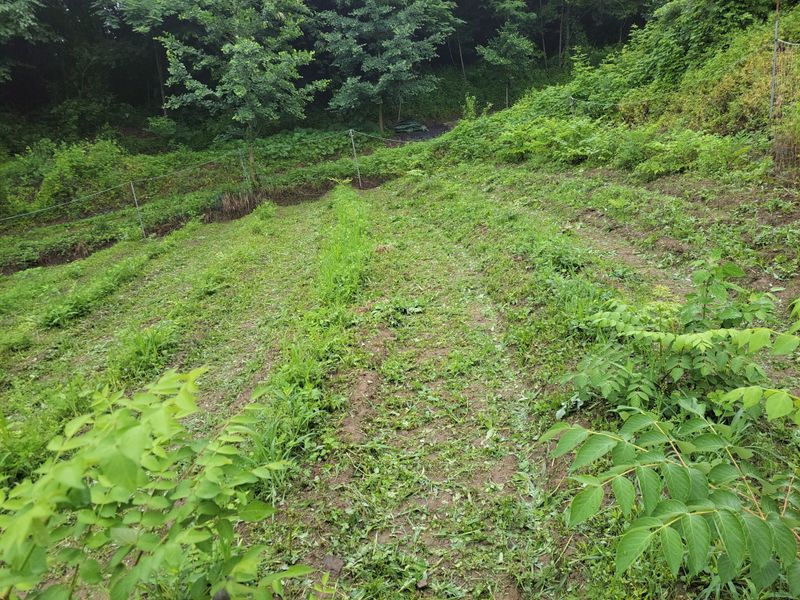 너른 밭 1차 예초작업이 끝났습니다. 끝나기 전과 후의 모습인데요. 아니나 다를까 처음 시잔한 쪽에는 새로 돋은 풀들이 또 보입니다. 아직도 바닥에 붙어 있는 엄나무들, 언제 커서 풀들을 이기려나ᆢ?