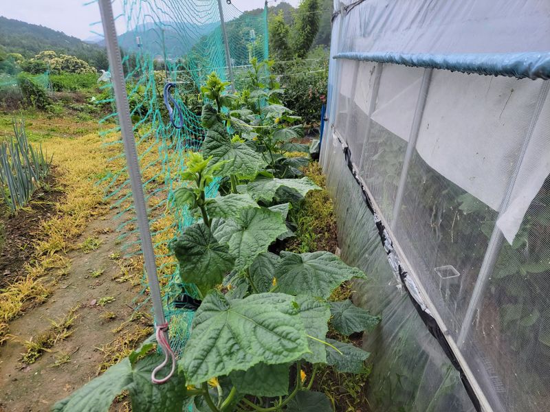 너른 밭 풀과의 전쟁, 잠시 소강상태가 되었습니다. 이제 장맛비에 또 새로 나는 풀 친구들ᆢ 얌전했으면 좋겠네요. 올해 처음 오이를 땄습니다. 늦어도 에지간히 늦었지요? 제가 그런게 아니고 날씨가 그랬지요^^