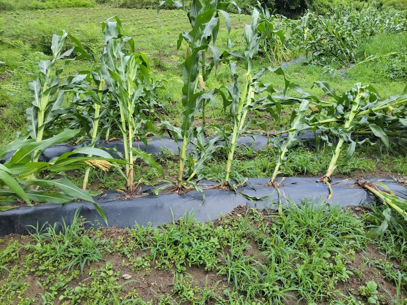 비바람에 쓰러졌던 옥수수 세우기, 가운데 말뚝을 박고 줄을 매어 그냥 받쳐 줬습니다. 농막 빈틈에 열무 씨를 뿌렸고요. 당근은 벌써 올라 왔습니다. 비가 그치니 또다시 폭염입니다. 건강관리가 우선이네요.