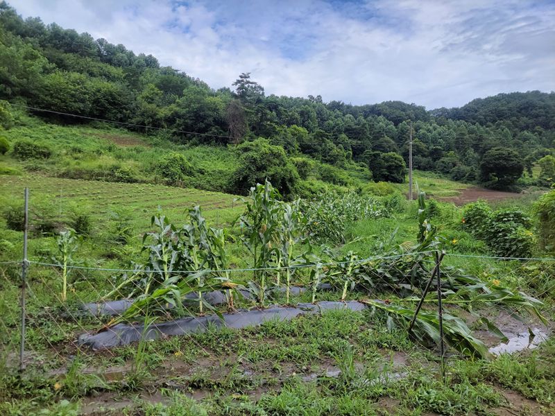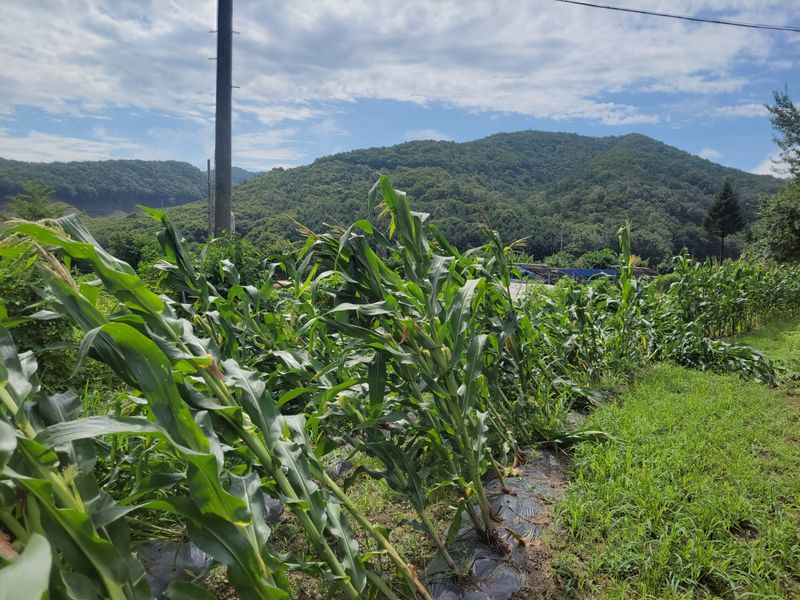 여기는 보은군 내북면 입니다. 비피해 심한 지역에 비하면 별거 아니지만, 제게는 첫 농사나 다름 없거든요. 일렬로 심어둔 옥수수들이 죄다ᆢ ㅜㅠ 일으켜 세워야 할지 그냥 둬야 할지 당최 감이 안옵니다. 일단 되는 대로 세우다 말고 또 비를 피해 드왔습니다.